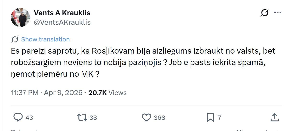 Viņš raksta: “Es pareizi saprotu, ka Rosļikovam bija aizliegums izbraukt no valsts, bet robežsargiem neviens to nebija paziņojis? Jeb e-pasts iekrita spamā, ņemot piemēru no Ministru Kabineta?”