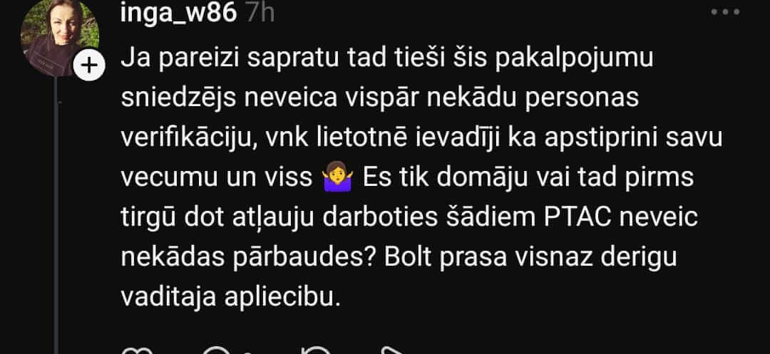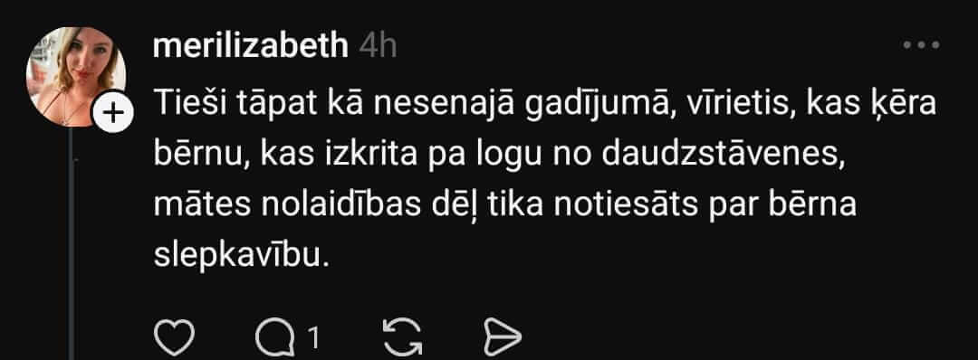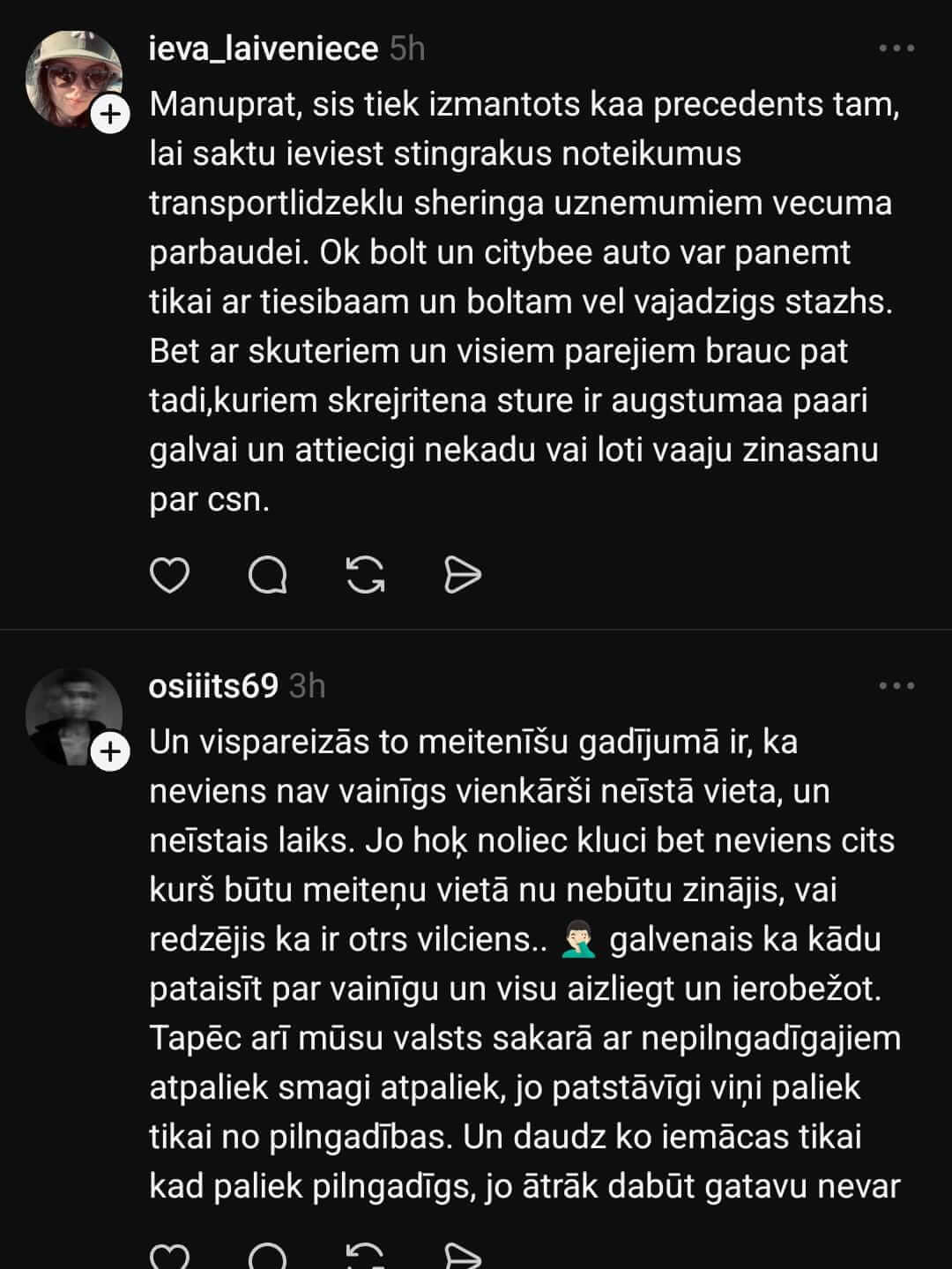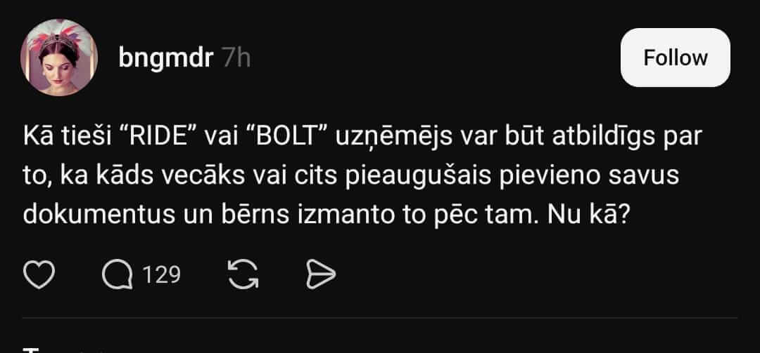 Sociālo mediju platformā “Threads” cilvēki apspriež negadījumu un izsaka savu viedokli, kuram būtu jāuzņemas atbildība. Lietotājs ar segvārdu @bngmdr raksta: “Kā tieši “RIDE” vai “BOLT” uzņēmējs var būt atbildīgs par to, ka kāds vecāks vai cits pieaugušais pievieno savus dokumentus un bērns izmanto to pēc tam. Nu kā?”