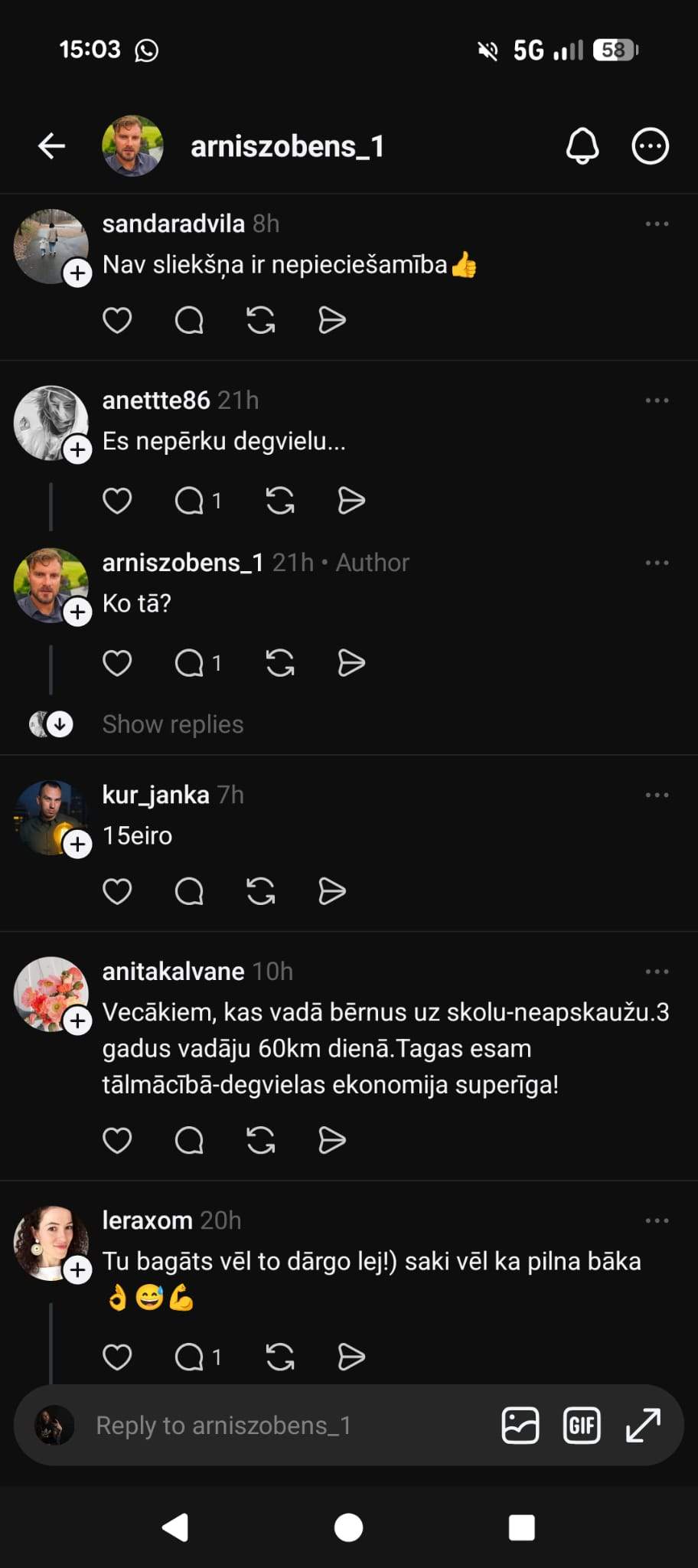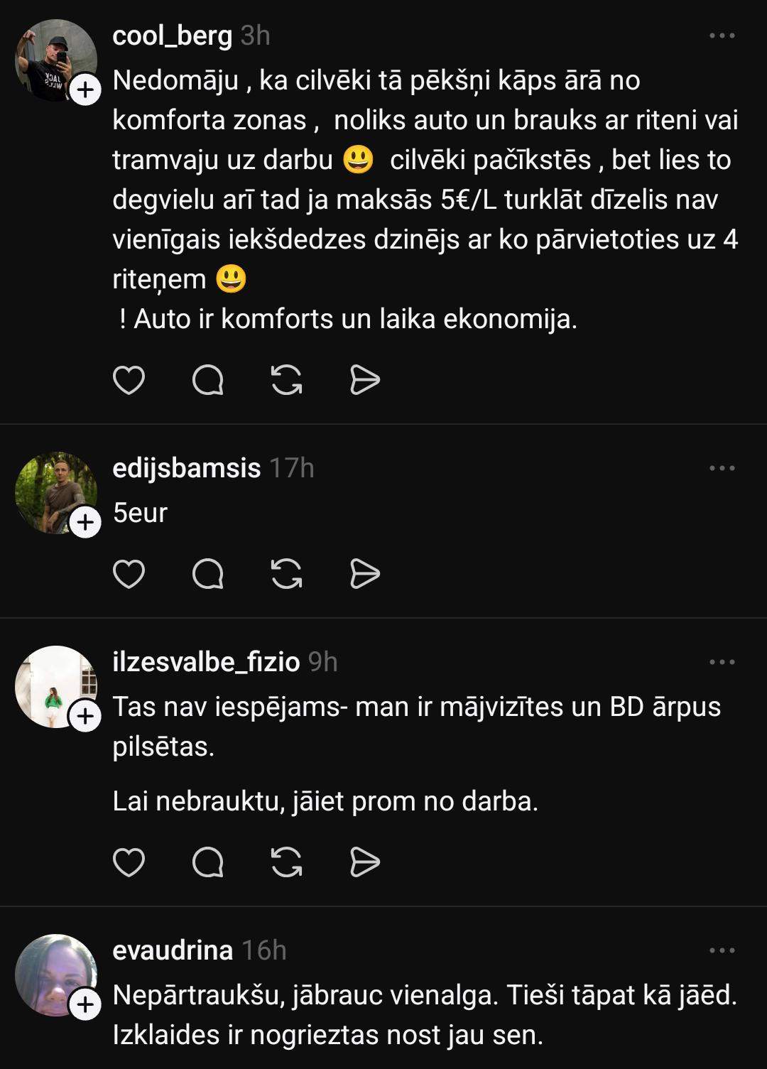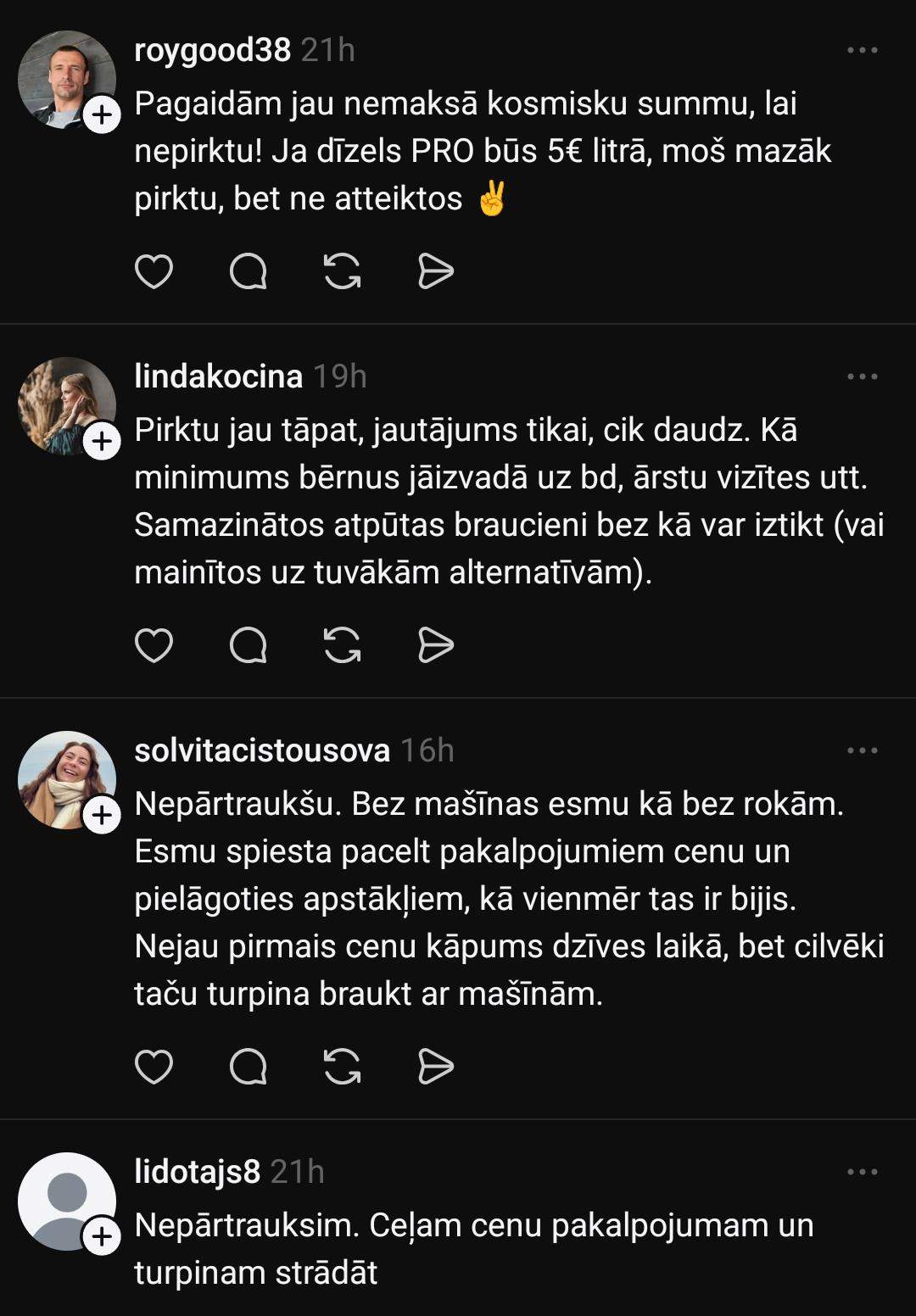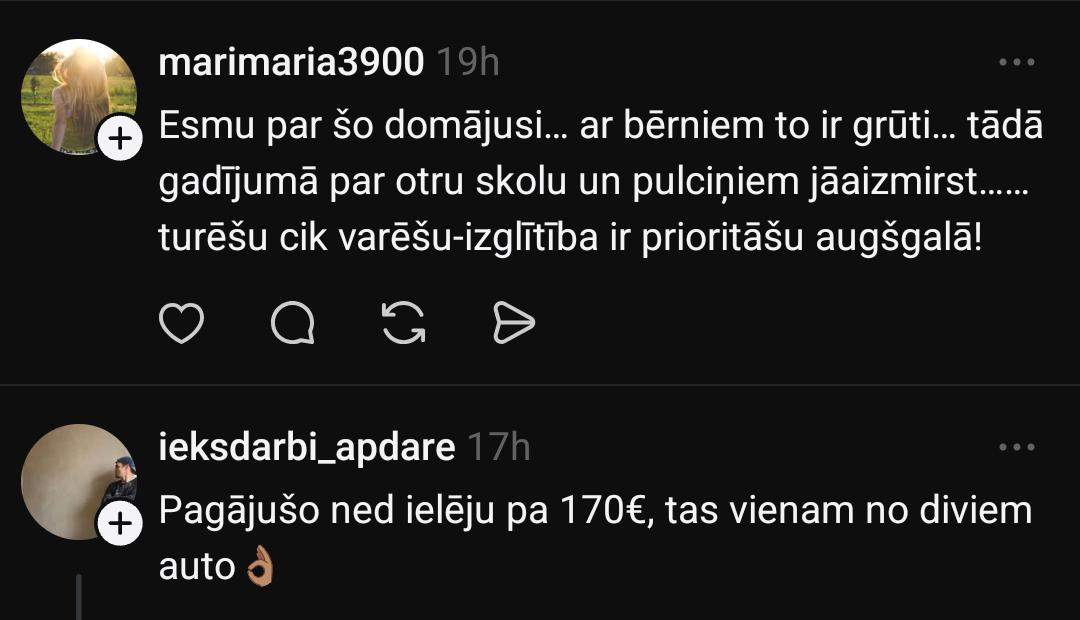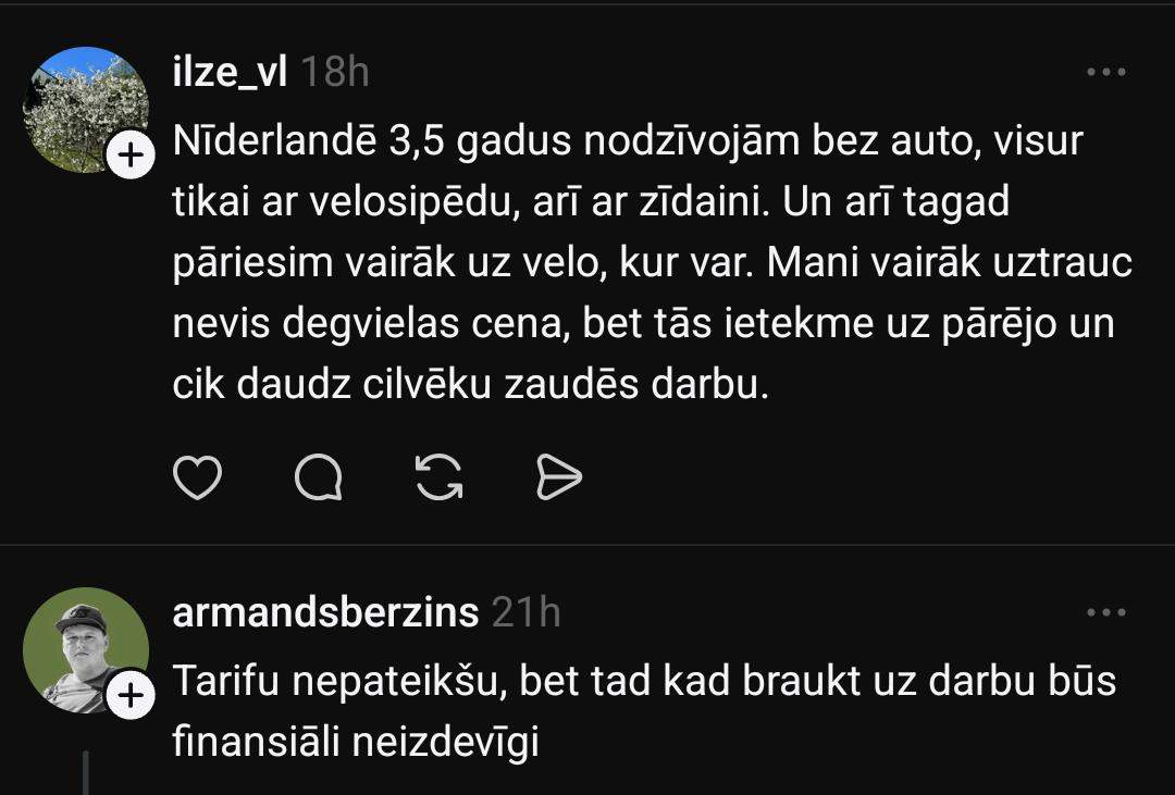 Linda raksta, ka degvielu pirktu tāpat: “Pirktu jau tāpat, jautājums tikai cik daudz. Kā minimums bērni jāizvadā uz bērnudārzu, jābrauc pie ārsta u.t.t. Samazinātos atpūtas braucieni, bez kuriem var iztikt, vai arī izvēlētos tuvākas alternatīvas.”