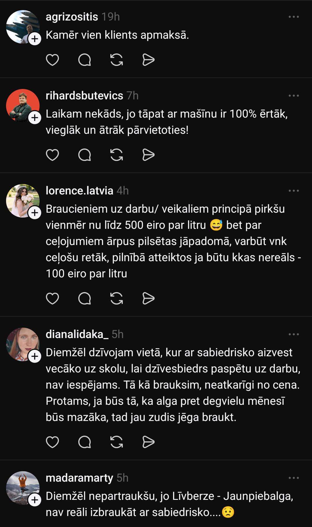 Savukārt Solvita atzīst, ka nav gatava atteikties no automašīnas: “Nepārtraukšu. Bez mašīnas esmu kā bez rokām. Esmu spiesta pacelt pakalpojumu cenas un pielāgoties apstākļiem, kā vienmēr tas ir bijis. Tas jau nav pirmais cenu kāpums dzīves laikā, bet cilvēki taču turpina braukt ar mašīnām.”