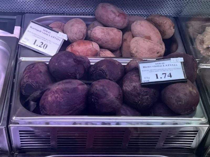 Laura veikalā pamanīja interesantu piedāvājumu, kas drīz vien pārtapa par diskusiju sociālo mediju platformā “Threads”. Viņa nofotografēja vitrīnu, kurā pārdod gatavus ēdienus, īpašu uzmanību pievēršot vārītām bietēm un kartupeļiem.
