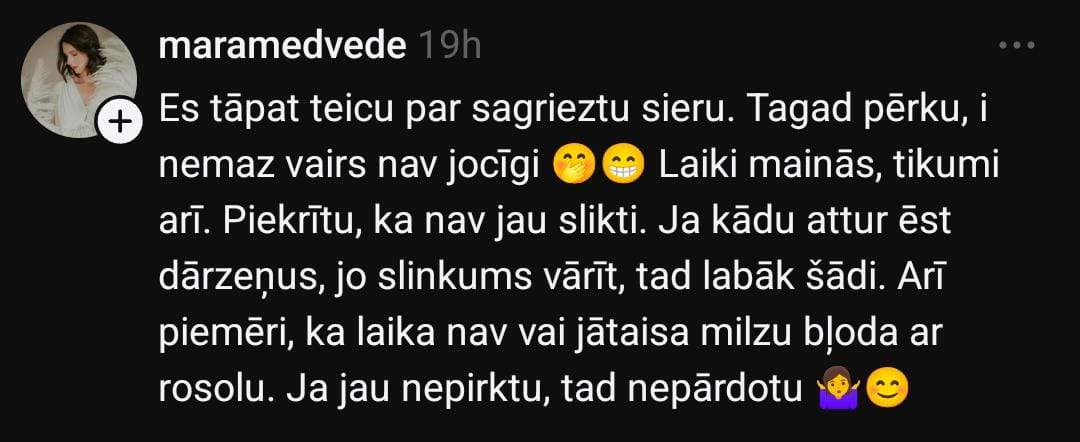 Savukārt Zaiga šādu ēdienu esamību kritizē: “Var būt tavā vietā arī apēst, jo slinkums būs muti kustināt? Un vispār, jūs neesat normāli. Kad tik negatvot un visu gatavu nopirkt, jo redz, elektrība jums dārga. Jautājums – nez kā jūsu vecāki un vecvecāki izdzīvoja, kad nebija nekas? Kauns man par jums.”