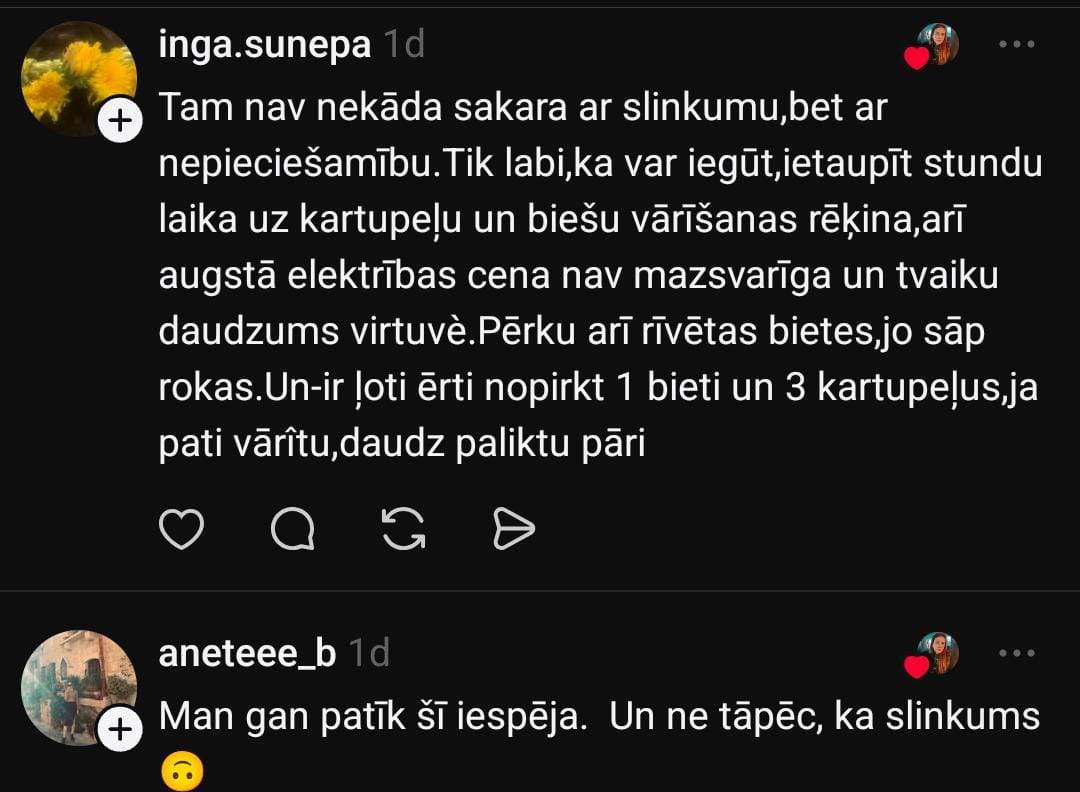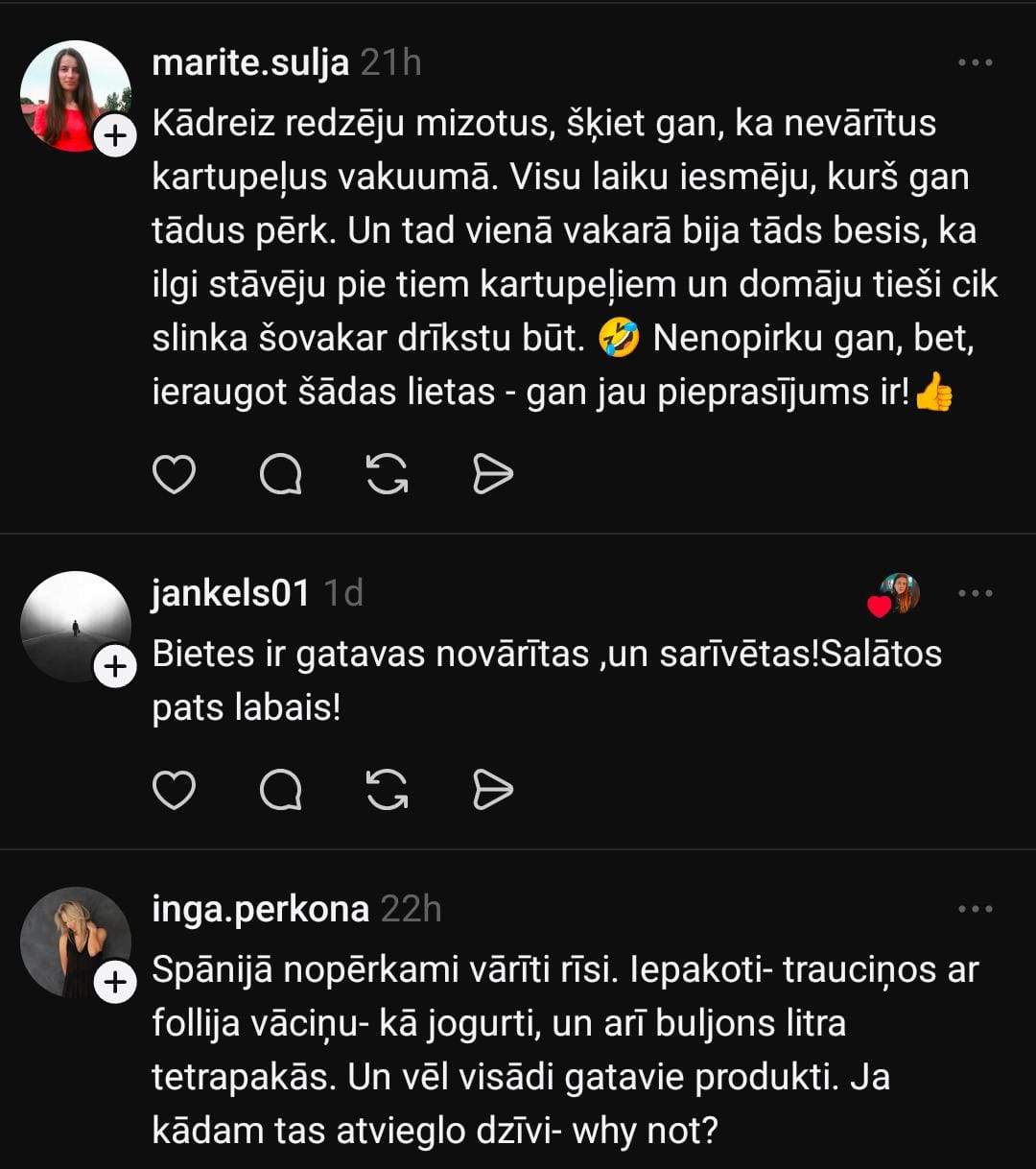 Liene priecājas par iespēju iegādāties gatavus produktus: “Man liekas, ļoti laba ideja 21. gadsimtā. Bietes jāvāra diezgan ilgi, un elektrība mājās arī nav par velti. Es tad rīkojos vēl trakāk – vienmēr bietes salātiem vai zupai pērku vakuuma paciņā, nomizotas un novārītas. Veikalā vēl neesmu pamanījusi jau novārītus kartupeļus, bet, ja tādi būtu, noteikti kādu reizi tos iegādātos, lai ietaupītu laiku ēdiena gatavošanā.”