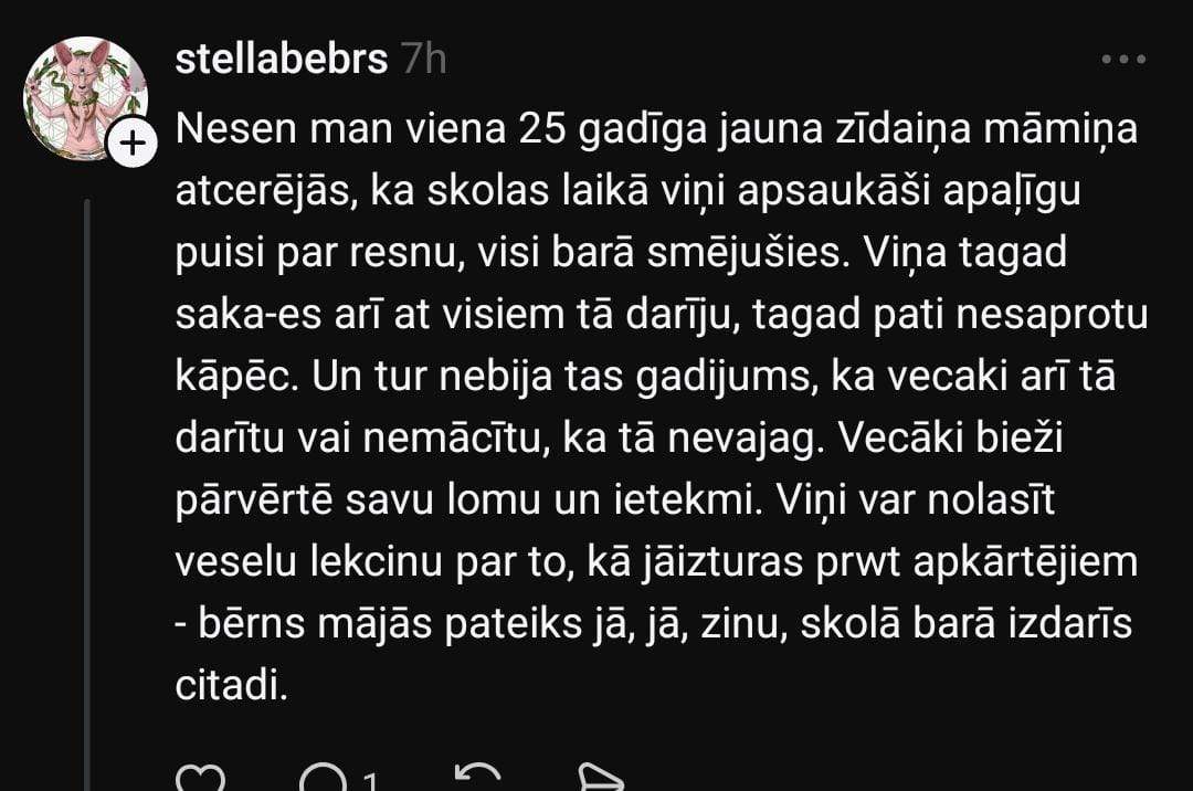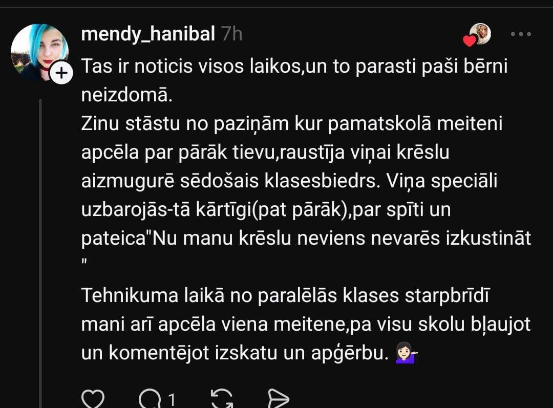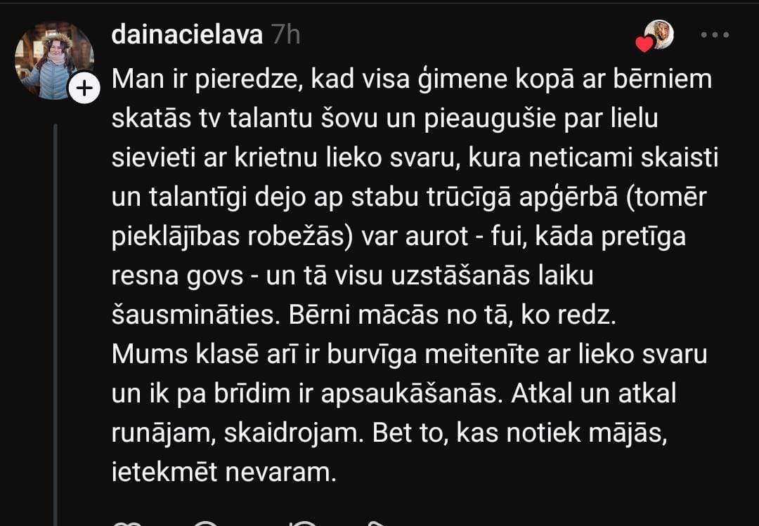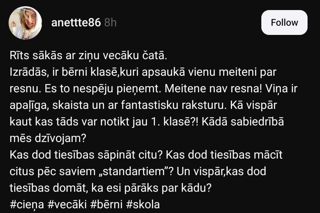 Sociālo mediju platforma “Threads” Anete dalās savā pārdzīvojumā, rakstot, ka viņas bērna klasē ir jaunieši, kuri apsaukā vienu meiteni par resnu. Anete uzskata, ka meitene ir skaista un ar fantastisku raksturu, taču sievieti visvairāk uztrauc fakts, ka šāda rīcība novērojama jau pirmajā klasē.