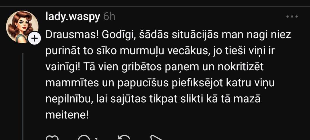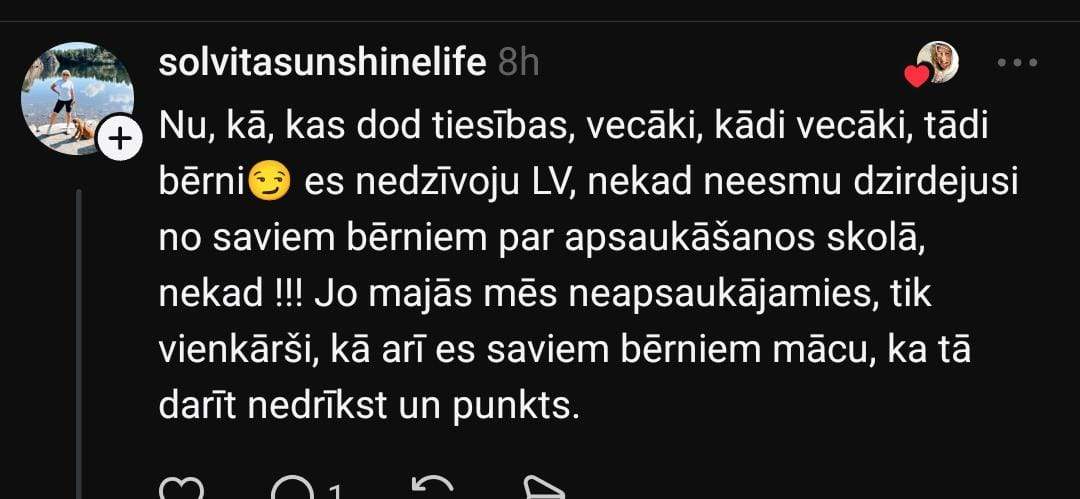 Komentāru sadaļā Diana norāda uz vecākiem. Viņa iesaka paklausīties, kā runā pašas mammas, un secināt, ka nav jābrīnās, ja bērni rīkojas tāpat, ja šādu piemēru rāda vecāki.