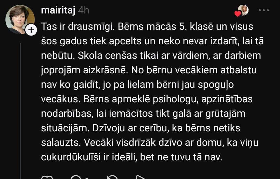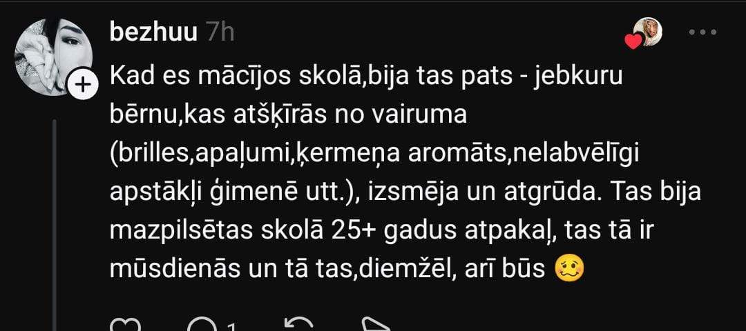 Skolas gadi aizņem lielu daļu no jauniešu dzīves, un nereti tieši skolas gadi ir tie, kas veido bērna personību. Tomēr ir jaunieši, kuriem došanās uz skolu ir smaga nasta, ko jāiztur daudzu gadu garumā, jo ir klases biedri, kuri uzskata, ka ir labāki par saviem vienaudžiem. Šādā situācijā dalās arī mamma Anete, kura vecāku čatā saņēmusi nepatīkamu ziņu.