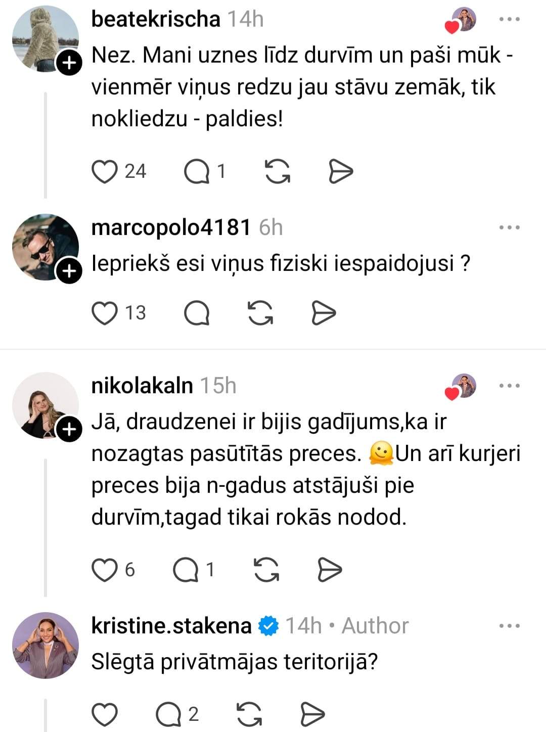 Vēl kāda komentētāja atklāj, ka viņas paziņai nozagtas pasūtītās preces slēgtā kāpņu telpā, kur, visticamāk, tās paņēmis kāds no kaimiņiem.