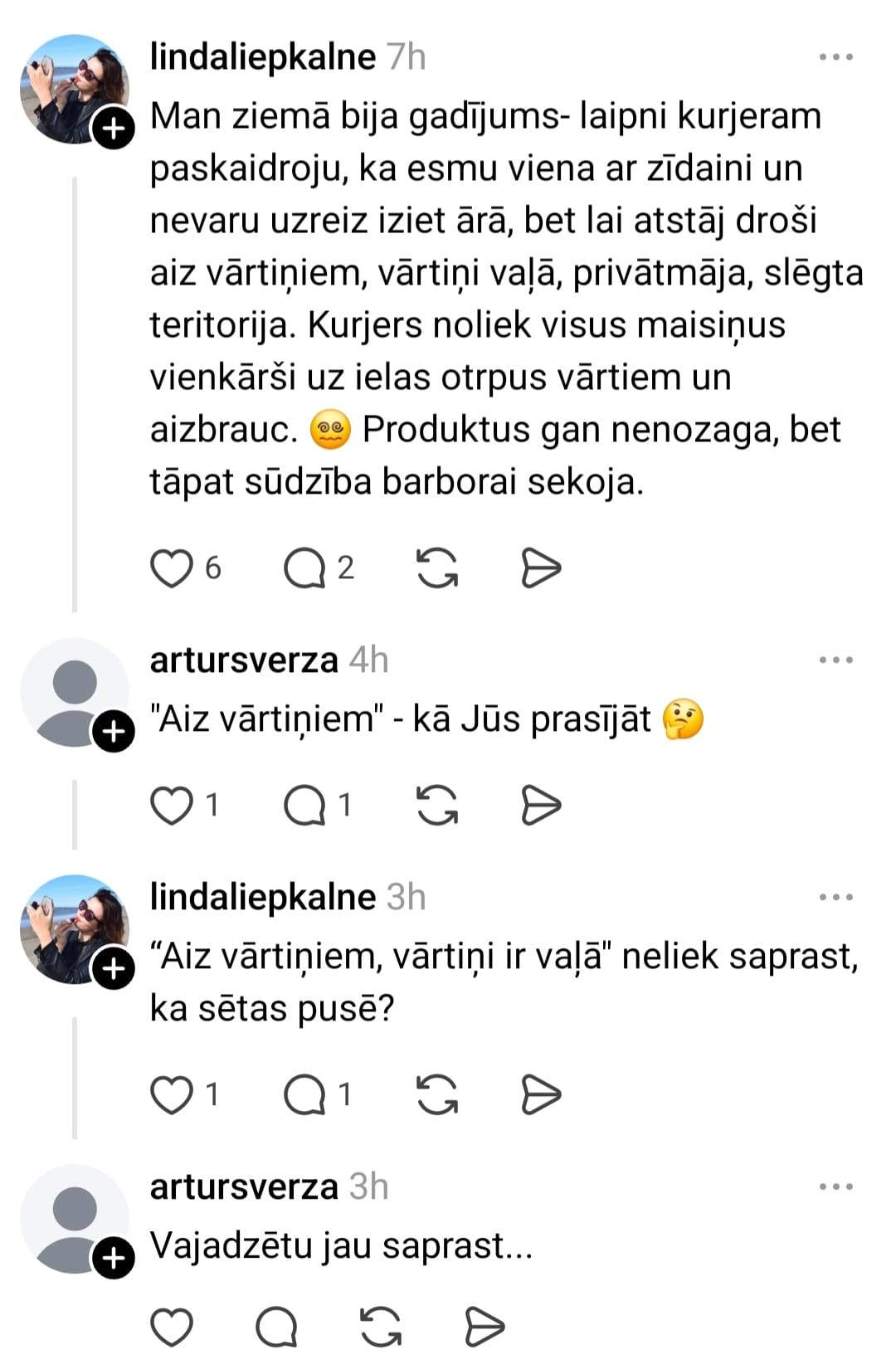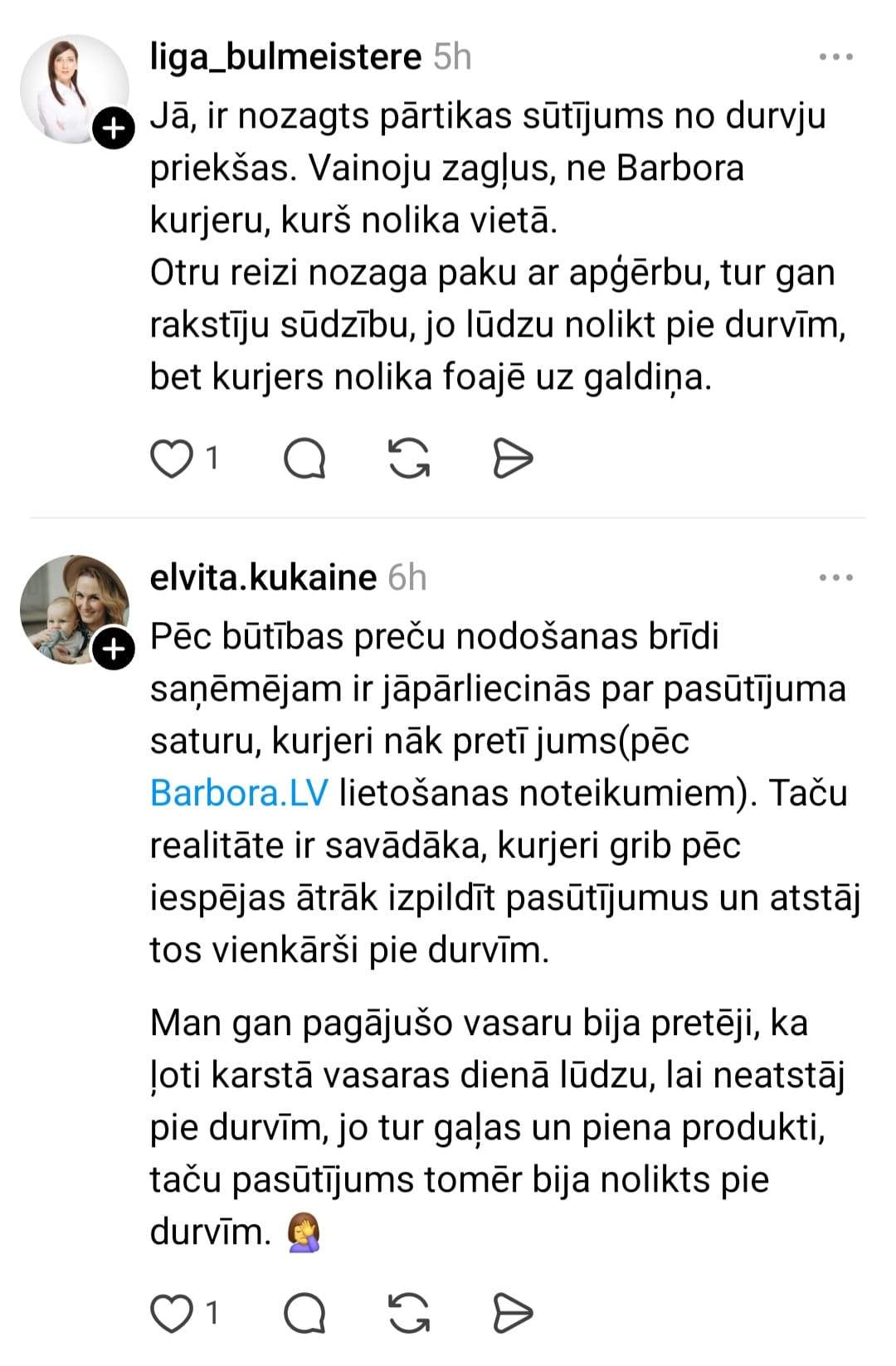 Komentāru sadaļā atklājas, ka līdzīgas pieredzes nav retums. Kāda lietotāja stāsta, ka pēc piegādes atklājusi – daļa pirkumu vienkārši pazudusi. Pēc sūdzības nauda gan atgriezta, taču, kur palika preces, tā arī nav skaidrs. Cita sieviete norāda, ka viņai kurjeri parasti visu atstāj pie durvīm, bet reiz pat saņēmusi zvanu ar aizrādījumu, ka tā darīt nevajadzētu – turklāt kurjers pat nesaprata latviski.