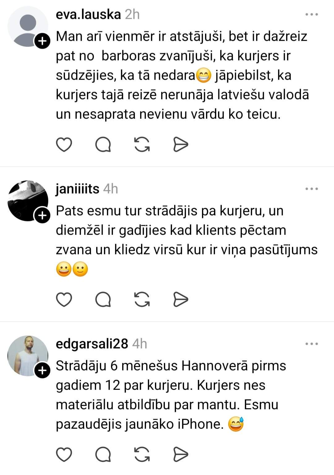 Savukārt kāds bijušais kurjers atzīst, ka problēmas mēdz rasties arī no klientu puses – gadās situācijas, kad cilvēki pēc tam zvana un sūdzas, ka pasūtījums nav saņemts. Tikmēr cits komentētājs dalās pieredzē no ārzemēm, uzsverot, ka kurjeri bieži vien neuzņemas materiālu atbildību par piegādātajām precēm.