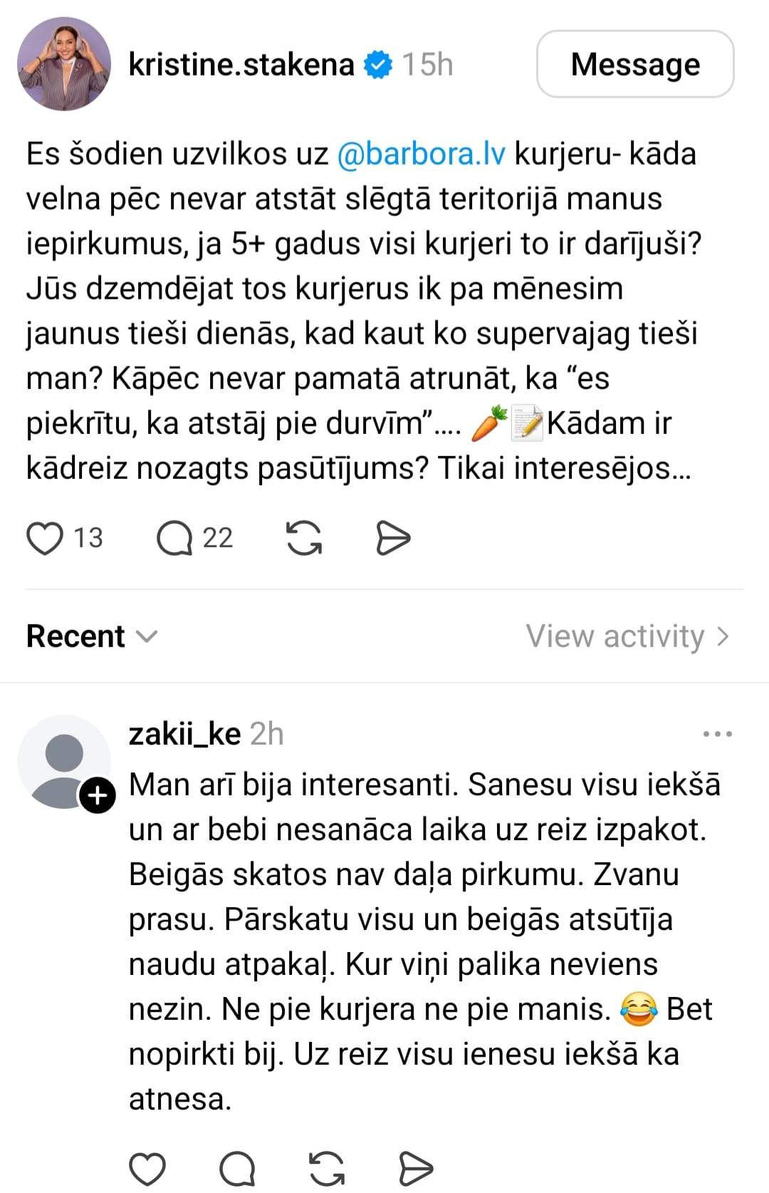 “Kāda velna pēc?” Kristīni Stakenu pamatīgi nokaitina “Barbora.lv” kurjers 0
