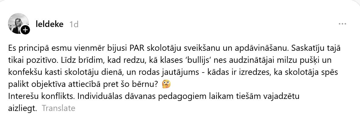 @lelde ke raksta: “Es principā esmu vienmēr bijusi PAR skolotāju sveikšanu un apdāvināšanu. Saskatīju tajā tikai pozitīvo. Līdz brīdim, kad redzu, kā klases ‘bullijs’ nes audzinātājai milzu pušķi un konfekšu kasti skolotāju dienā, un rodas jautājums – kādas ir izredzes, ka skolotāja spēs palikt objektīva attiecībā pret šo bērnu? Interešu konflikts. Individuālas dāvanas pedagogiem laikam tiešām vajadzētu aizliegt.”