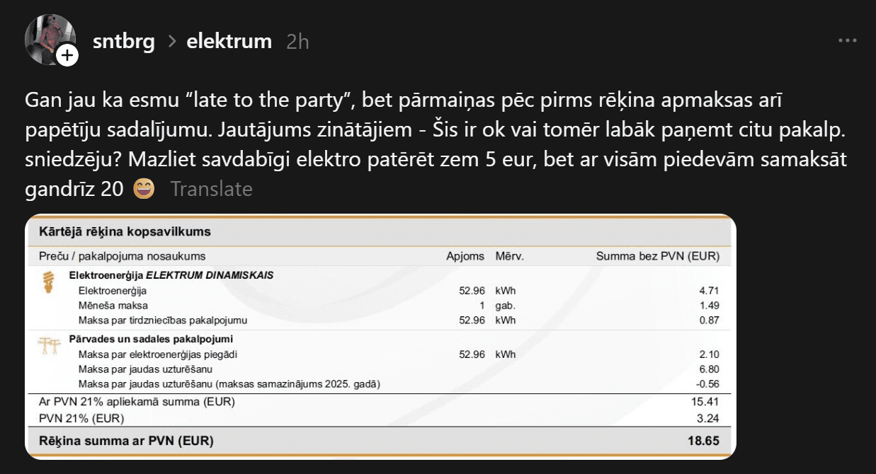 “Gan jau, ka esmu “late to the party”, bet pārmaiņas pēc pirms rēķina apmaksas arī papētīju sadalījumu. Jautājums zinātājiem – vai šis ir okei, vai tomēr labāk paņemt citu pakalpojumu sniedzēju? Mazliet savdabīgi – elektroenerģiju patērēt zem 5 eiro, bet ar visām piedevām samaksāt gandrīz 20,” vietnē “Threads” raksta kāda sieviete.