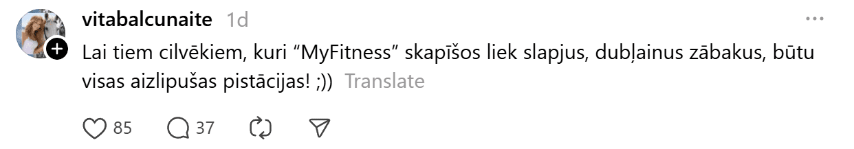 “Lai tiem cilvēkiem, kuri “MyFitness” skapīšos liek slapjus, dubļainus zābakus, būtu visas aizlipušas pistācijas,” rakstīja Balčunaite, pievēršot uzmanību savstarpējās cieņas jautājumiem koplietošanas telpās.