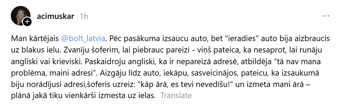 Vēl kāda norāda, ka šodien, laikam, “Bolt” taksistiem nav laba diena.