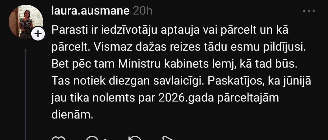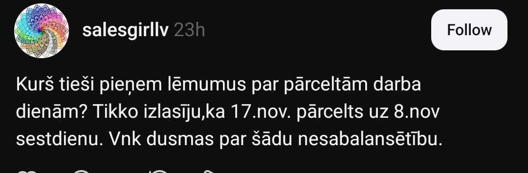 Lietotāja ar segvārdu @salesgirllv sociālo mediju platformā “Threads” jautā: “Kurš tieši pieņem lēmumus par pārceltām darba dienām? Tikko izlasīju, ka 17.nov. pārcelts uz 8.nov sestdienu. Vienkārši dusmas par šādu nesabalansētību.”