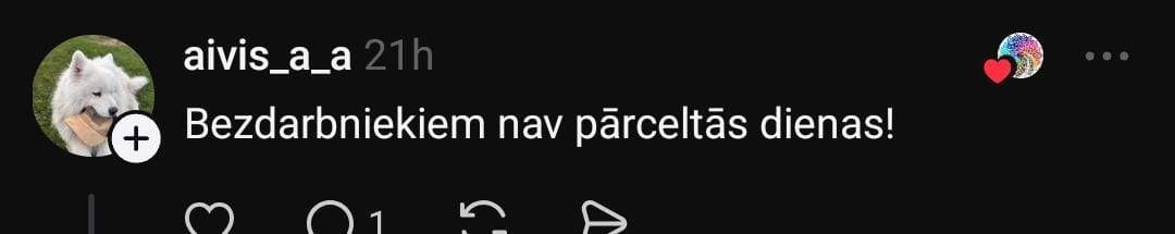 Lietotājs @shtipokawa uzskata, ka brīvdienu pārcelšana ir pilnīgi bezjēdzīgs pasākums, īpaši tiem, kuri strādā privātā sektorā. “Ja kādam ļoti vajag, tad var paņemt atvaļinājumu tajā dienā.”