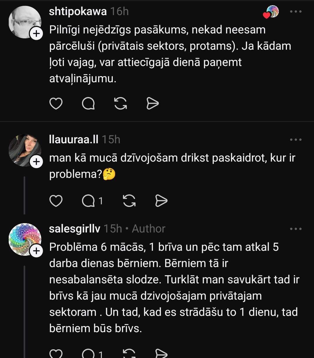 Kāda cita sociālā medija lietotāja iebilst diskusijas autores paustajam viedoklim un norāda, ka šoreiz jūtas pretēji: “Es – tieši otrādi – pirmo reizi priecājos par normālu pārcelšanu. Citādi parasti pārceļ uz nākamo 6dienu. Tu tās 4 dienas atpūties, bet pēc tam rauj tikai ar 1 brīvdienu un jau vairs neatceries, par ko bija jāatstrādā.”