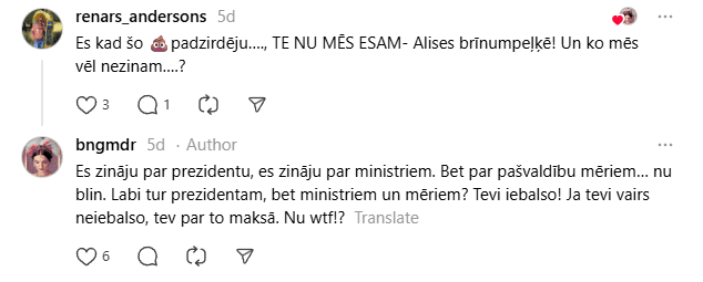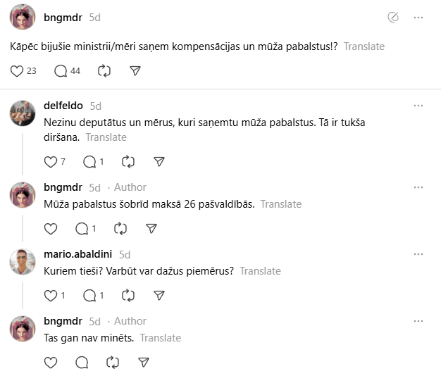 “Kāpēc bijušie ministri un mēri saņem kompensācijas un mūža pabalstus,” vaicāja kāda “Threads” lietotāja.