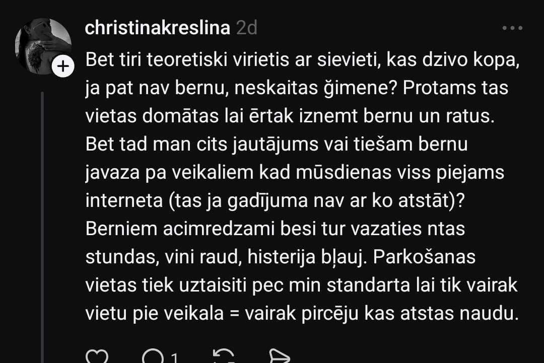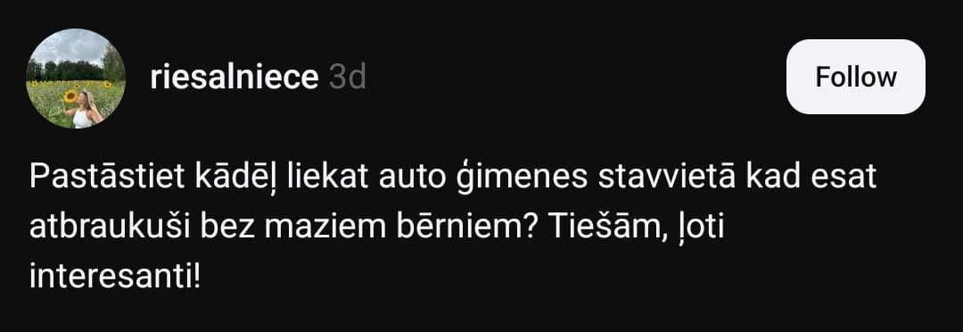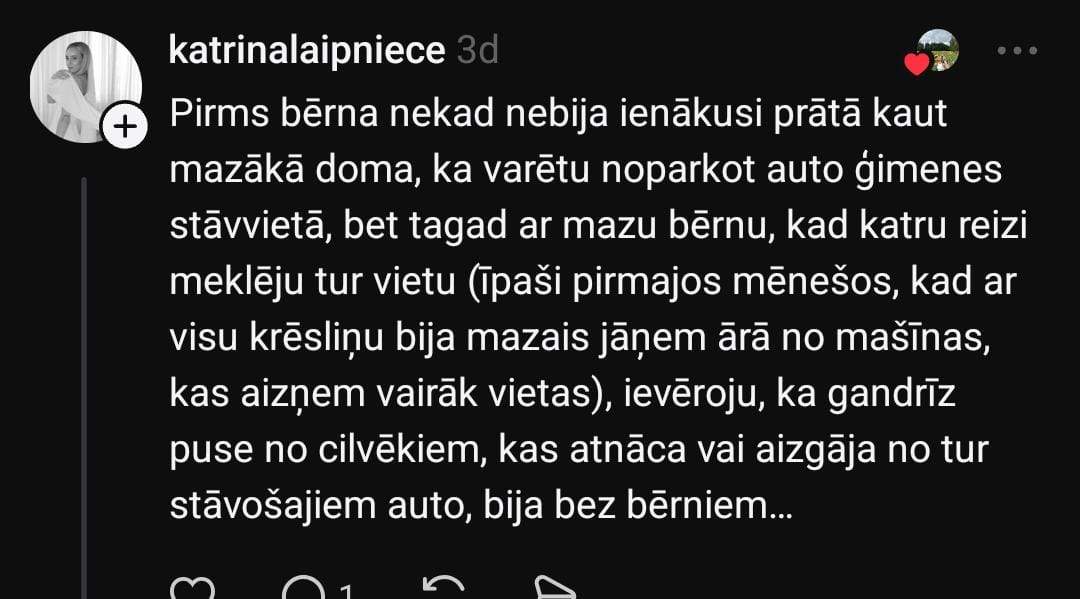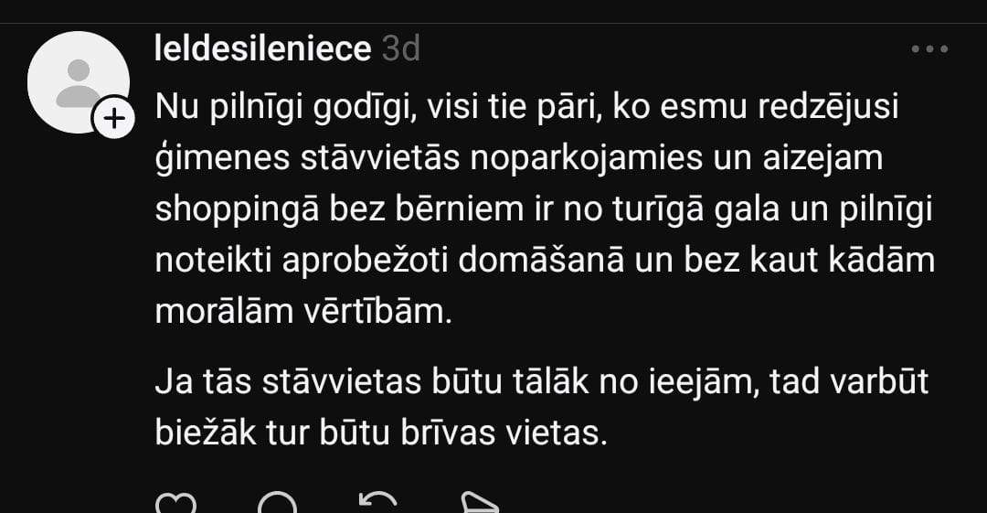 Kādai lietotājai rodas pretjautājums: “Man autorei pretjautājums – kas ģimenēm ar bērniem traucē novietot auto tālākā malā – lai tās durvis var plaši atvērt? Vai tiešām ģimenes stāvvietai ir tik pat nozīmīga nozīme kā invalīdiem?! Izvietojums šīm stāvvietām ir līdzās…