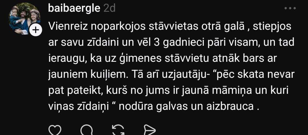Kāda sieviete dalās savā pieredzē: “Bija gadījums, kad noparkojos ģimenes vietā , blakus arī ģimenes vietā iebrauc auto, iziet pārītis.