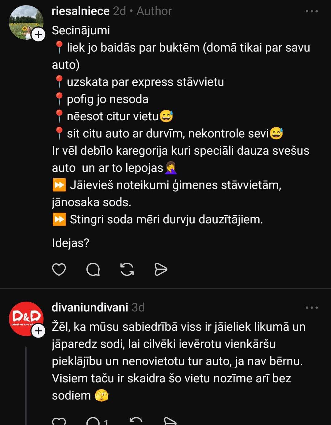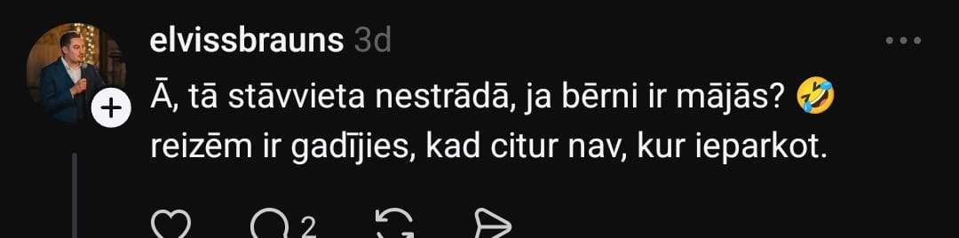 Rasa sociālo mediju platformā “Threads” raksta: “Pastāstiet kādēļ liekat auto ģimenes stāvvietā kad esat atbraukuši bez maziem bērniem? Tiešām, ļoti interesanti!”