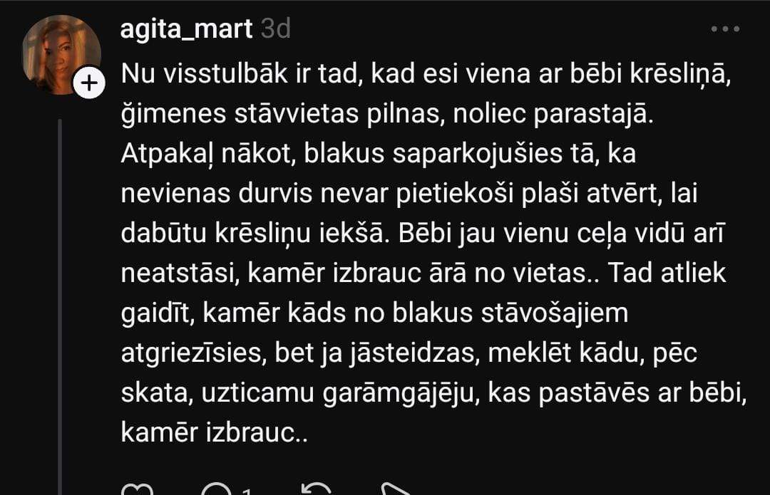 Arī Ketija piekrīt, ka viss nav līdz galam pārdomāts: “Nezinu, vai visur definēts, bet noteikums ir gan, ka jābūt redzamam bērna autokrēsliņam mašīnā. No otras puses arī nav pareizi, ja man bērns ir zīdainis, tad es to krēslu ar visu zīdaini ņemšu līdzi uz veikalu.