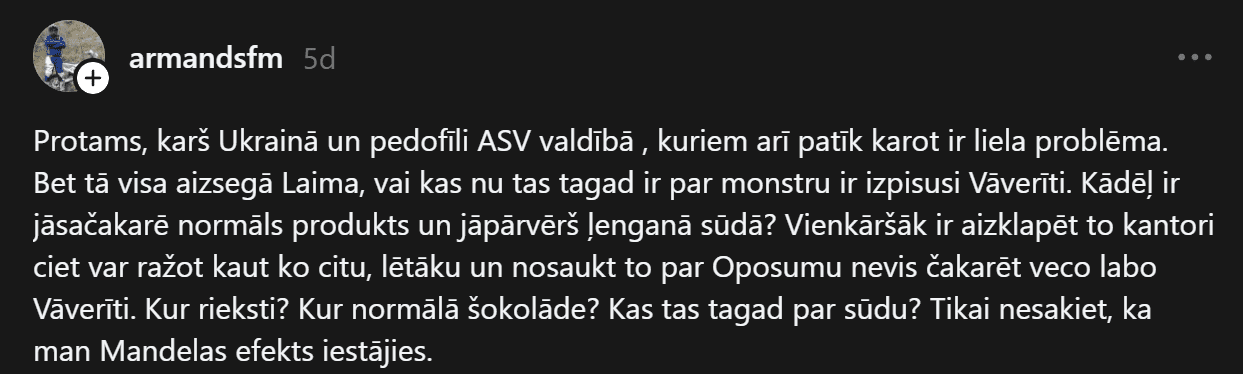 Šoreiz kritiķu nagos kritusi iemīļotā vafeļu torte “Vāverīte”. Kāds pircējs vietnē “Threads” raksta: “Protams, karš Ukrainā un pedofīli ASV valdībā, kuriem arī patīk karot, ir liela problēma. Bet tā visa aizsegā “Laima”, vai kas nu tas tagad ir par monstru, ir izbojājusi “Vāverīti”. Kādēļ ir jāsačakarē normāls produkts un jāpārvērš ļenganā sūdā? Vienkāršāk ir aizklapēt to kantori ciet – var ražot kaut ko citu, lētāku un nosaukt to par “Oposumu” nevis čakarēt veco labo “Vāverīti”. Kur rieksti? Kur normālā šokolāde? Kas tas tagad par sūdu? Tikai nesakiet, ka man Mandelas efekts iestājies.”