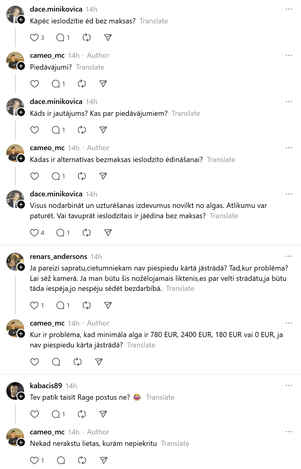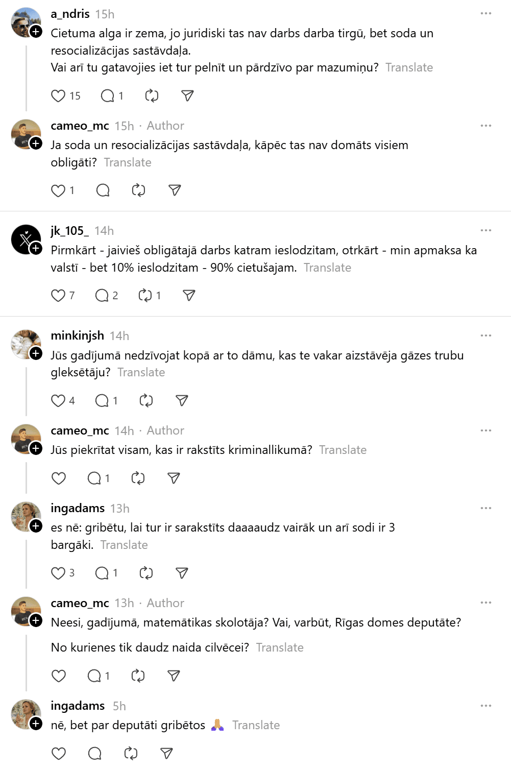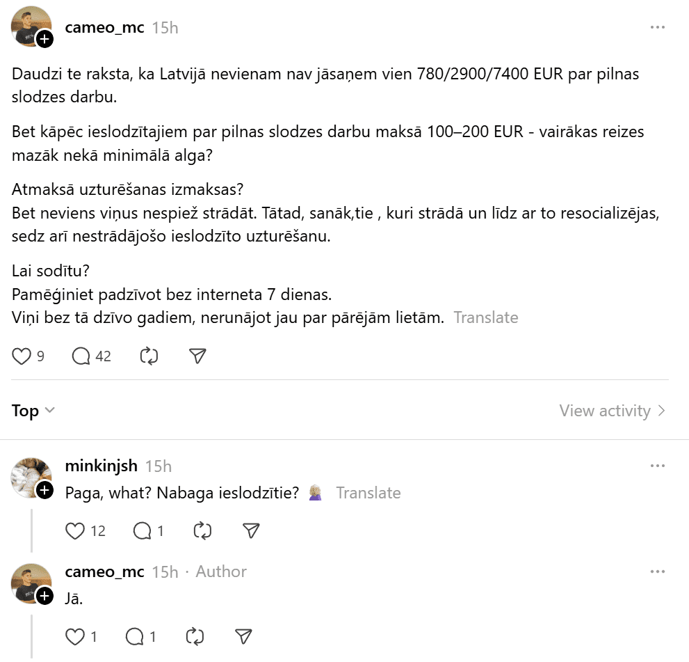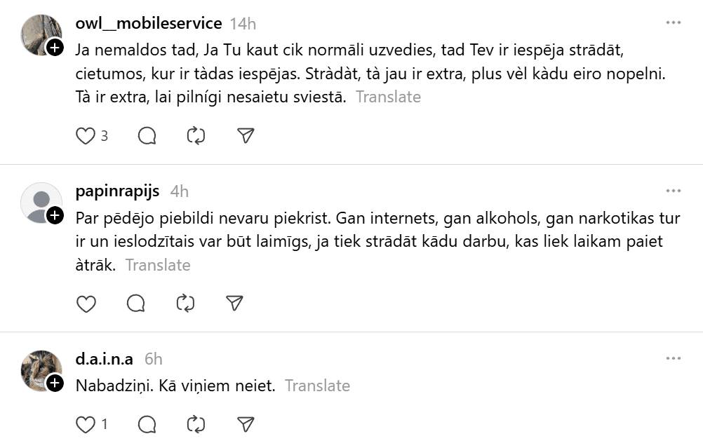 “Threads” lietotājs raksta: “Daudzi te raksta, ka Latvijā nevienam nav jāsaņem vien 780/2900/7400 EUR par pilnas slodzes darbu. Bet kāpēc ieslodzītajiem par pilnas slodzes darbu maksā 100–200 EUR – vairākas reizes mazāk nekā minimālā alga? Atmaksā uzturēšanas izmaksas?