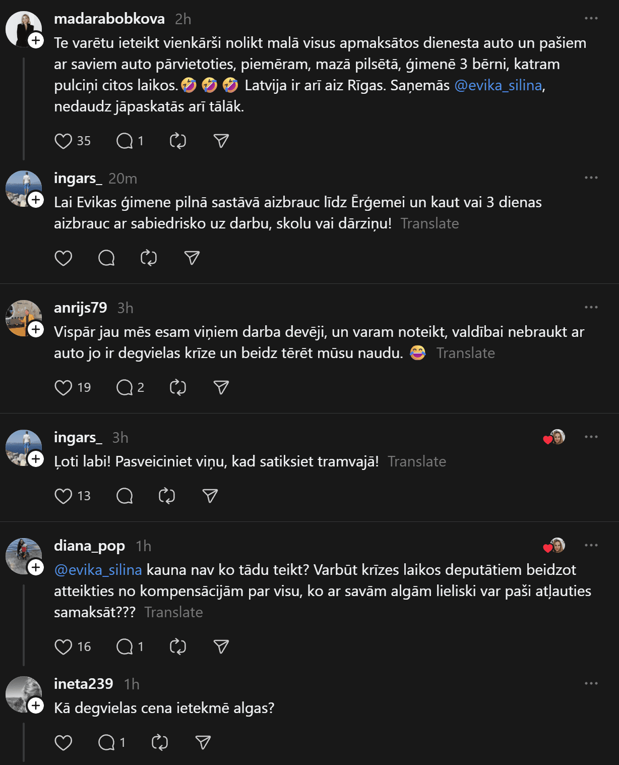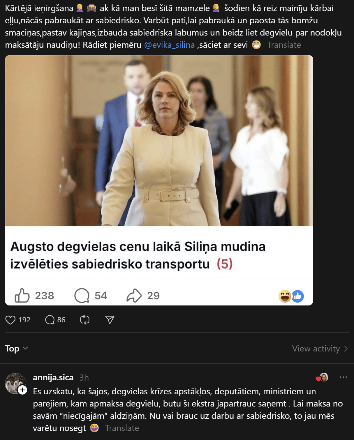 “Kārtējā ieņirgšana, ak, kā man besī šitā mamzele. Šodien kā reiz mainīju kārbai eļļu, nācās pabraukāt ar sabiedrisko. Varbūt pati, lai pabraukā un paosta tās bomžu smaciņas, pastāv kājiņās, izbauda sabiedriskā labumus un beidz liet degvielu par nodokļu maksātāju naudiņu! Rādiet piemēru, Evika Siliņa, sāciet ar sevi!”