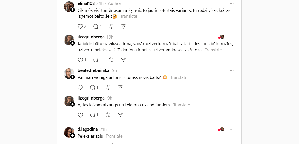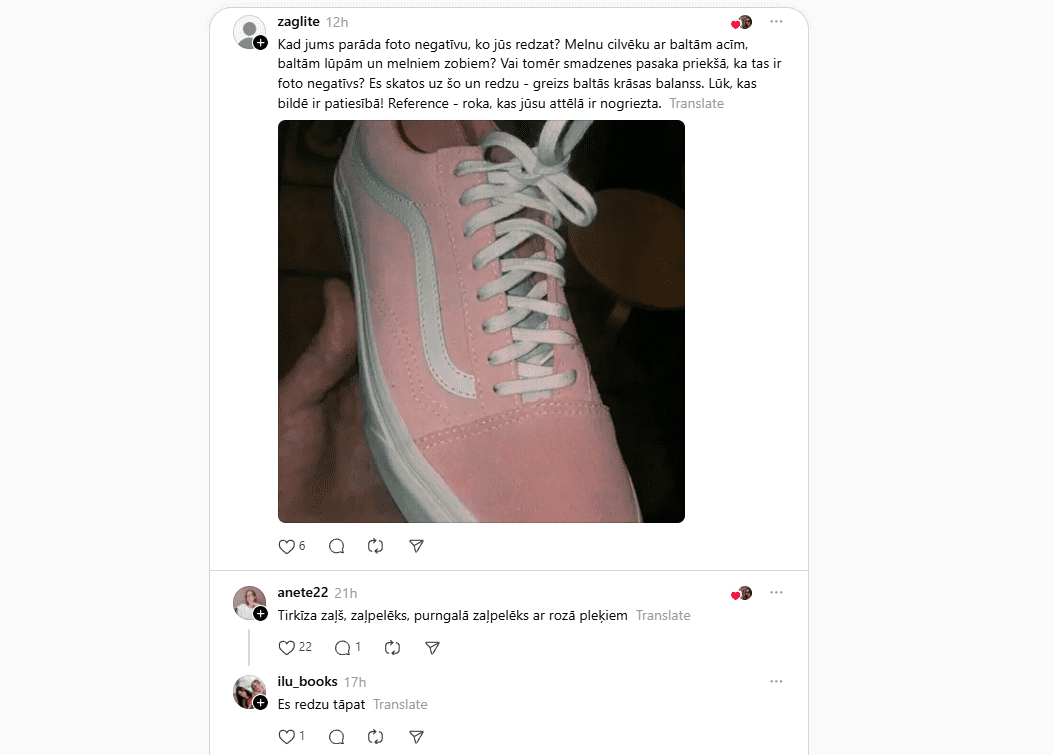 Pirmā nometne stingri stāv par to, ka apavi ir rozā ar baltām šņorēm. Viņi ir gatavi zvērēt pie visiem svētajiem, ka tur nav nekā cita. Otrā nometne ar neizpratni plikšķina acis, jo ekrānā redz izteikti pelēku un piparmētru zaļu (tirkīza) kombināciju.