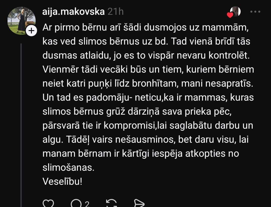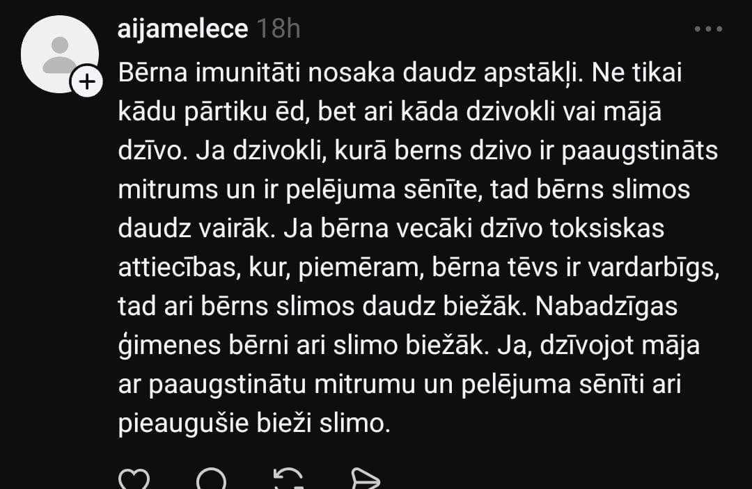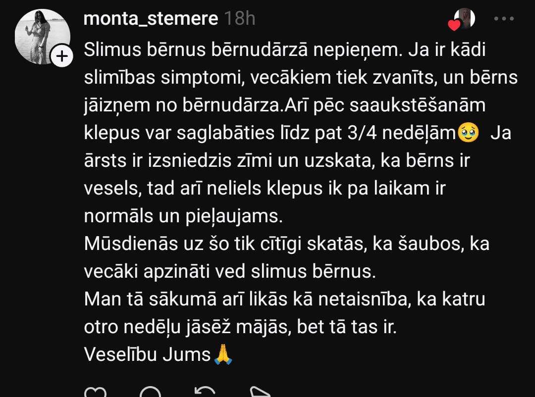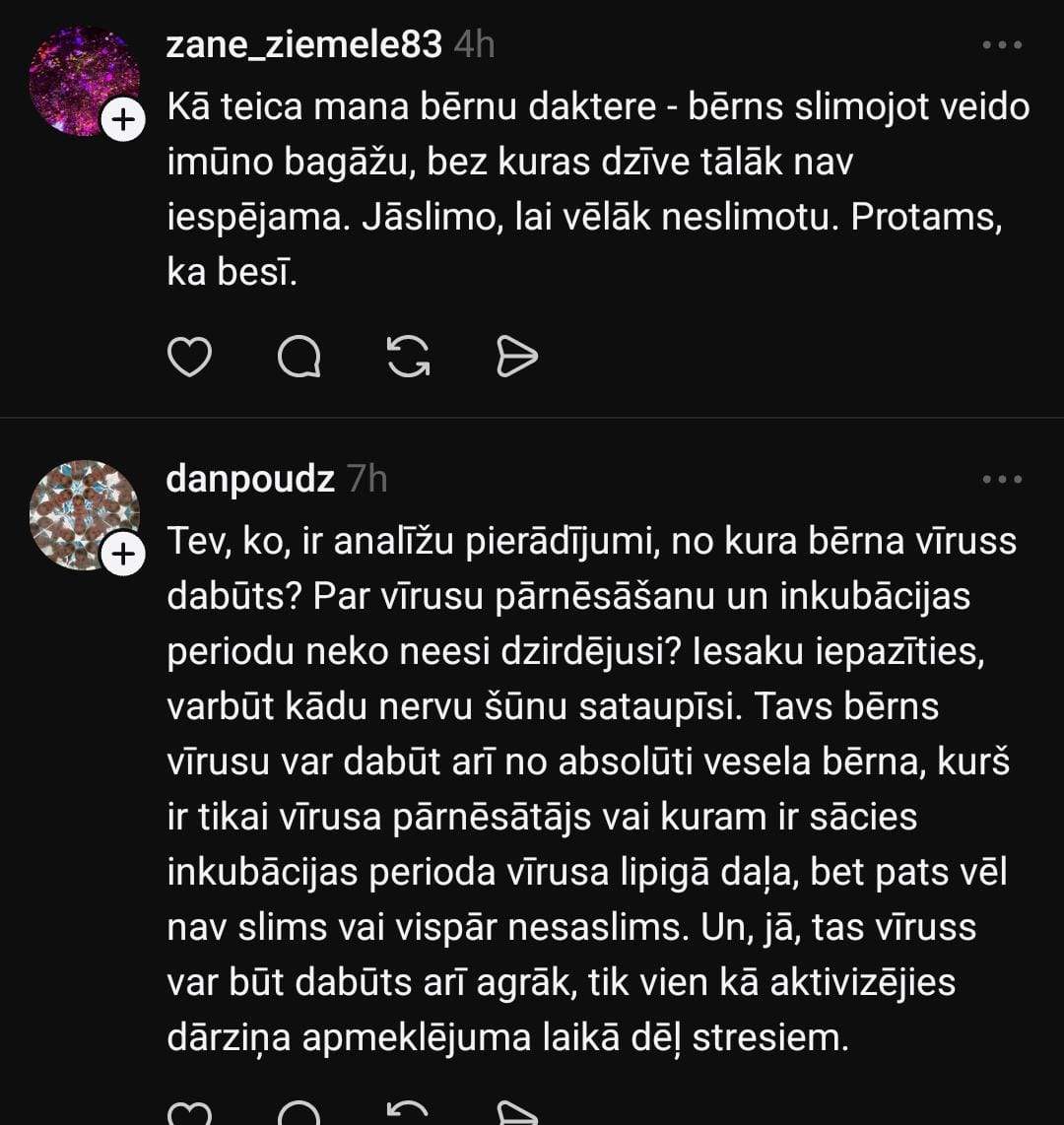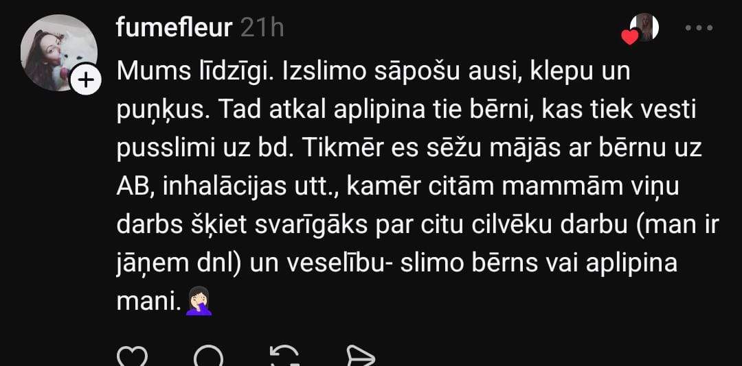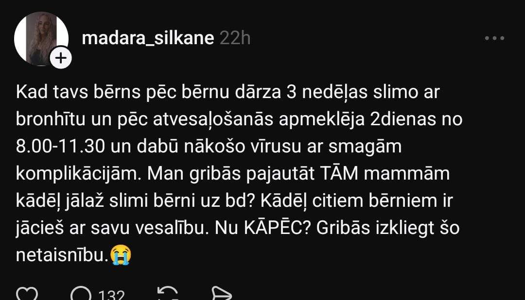 Madara sociālo mediju platformā “Threads” dalās savās pārdomās: “Kad tavs bērns pēc bērnu dārza 3 nedēļas slimo ar bronhītu un pēc atveseļošanās apmeklēja 2 dienas no 8.00-11.30 un dabū nākamo vīrusu ar smagām komplikācijām. Man gribās pajautāt TĀM mammām kādēļ jālaiž slimi bērni uz bērnu dārzu? Kādēļ citiem bērniem ir jācieš ar savu veselību. Nu KĀPĒC? Gribās izkliegt šo netaisnību.”