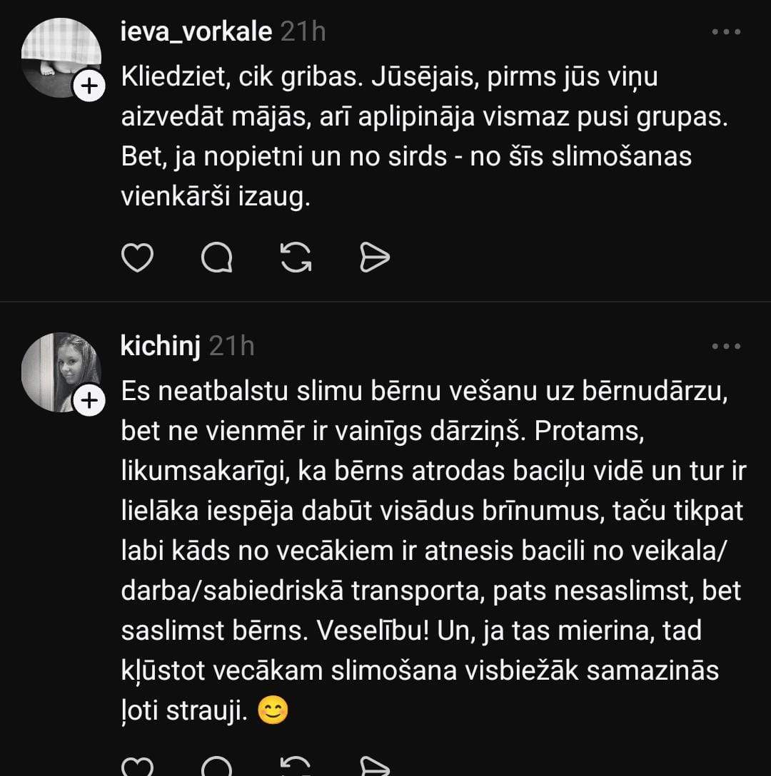 Kāda cita soctīkla lietotāja izsakās tieši un konkrēti: “Ai man atkal tracina šīs raganu medības. Nevaru ciest! Mammas, kas psiho par to, ka citas mammas ķip ved slimus bērnus uz dārziņu un Jūsējais no tā nokrīt ar kaut kādu zarazu – jūs gribat teikt, ka nekur citur bez mājām un dārziņā Jūs un ģimenes locekļi neuzturas, kur varētu gada tumšajā periodā būt baciļi? Uz/no darba neejat, veikalā arī ne, un laukumiņā jau nu galīgi ne? Es nesaku ka ir ok vest slimus bērnus, kam ir caureja, vemšana, temperatūra- tas nav gudri, BET…