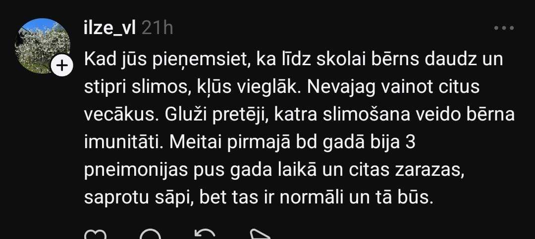 No mammu perspektīvas – ne jau jums vienīgām ir uz darbu jāiet. Arī citām mammām jāstrādā un ne visās ģimenēs ir omes kas var pieskatīt. Tad ir jāņem aukle, kas sēž ar iesnainu bērnu mājās un liela daļa nopelnītā ir jāatdod auklei. Tam slimošanas posmam ir vienkārši jāiziet cauri bez vainīgo meklēšanas vēlams. Nevienai no mums nav viegli.”