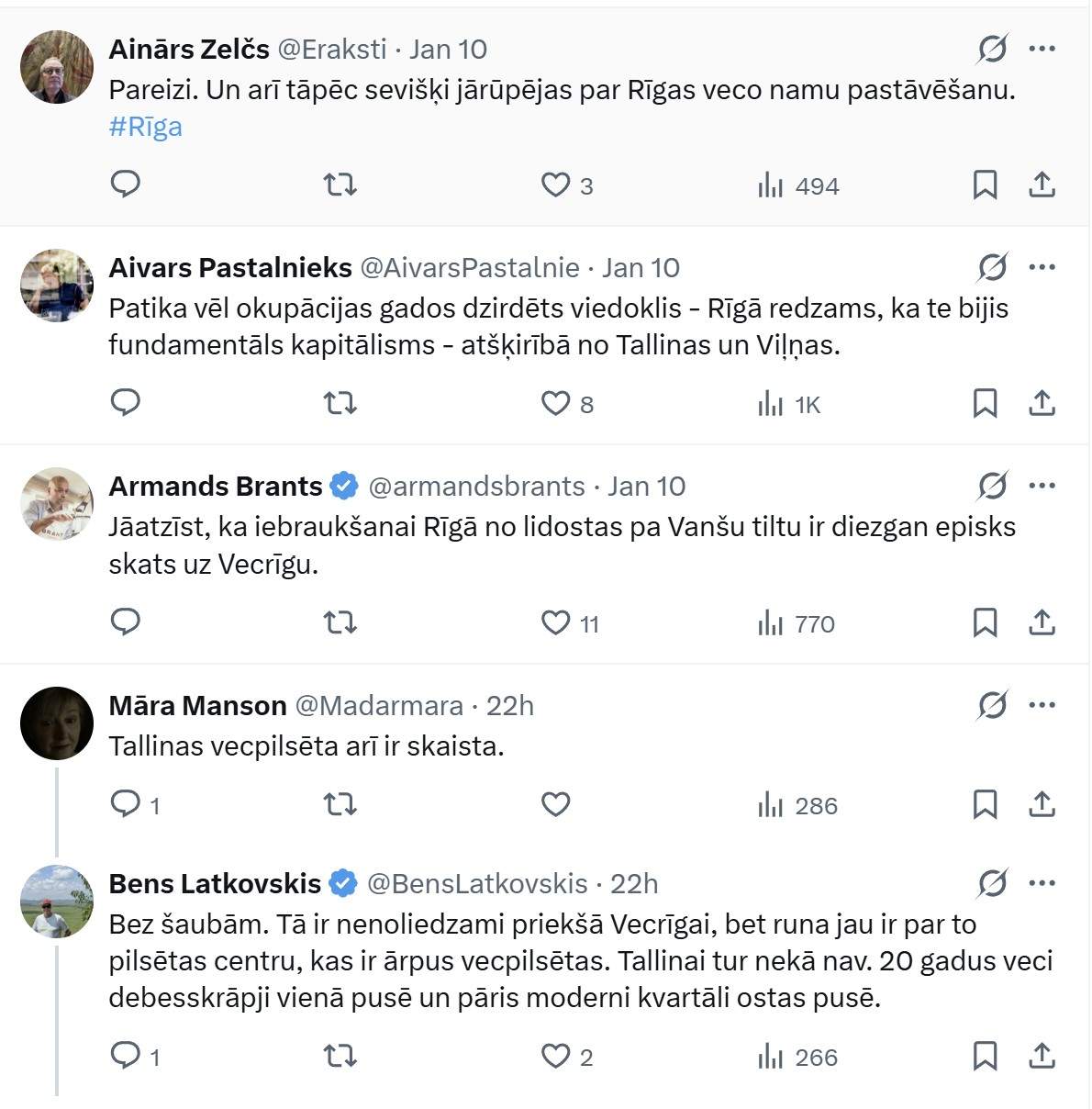Bens raksta: “Katru reizi, kad no Liepājas (vai citas vietas) atbraucu uz Rīgu, nebeidzu brīnīties par tiem, kuri starp Baltijas valstu galvaspilsētām dod priekšroku Tallinai vai Viļņai. Tās abas taču ir sīkas, provinciālas pilsētiņas iepretim Rīgai, kura vismaz vietējā mērogā var palepoties ar imperiālu lielpilsētas šarmu. Tādi jaunie kvartāli kādi ir Tallinā un Viļņā pasaulē ir vismaz tūkstoš pilsētām, kamēr tāds centrs kā Rīgai ne vairāk kā simts.”