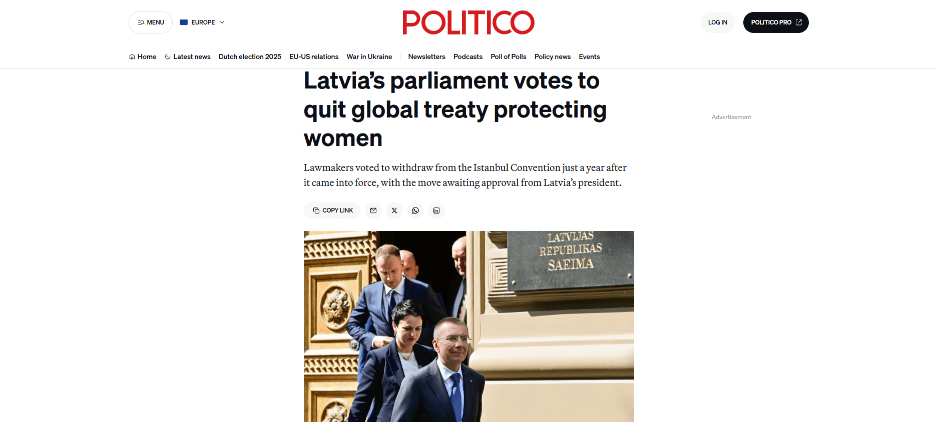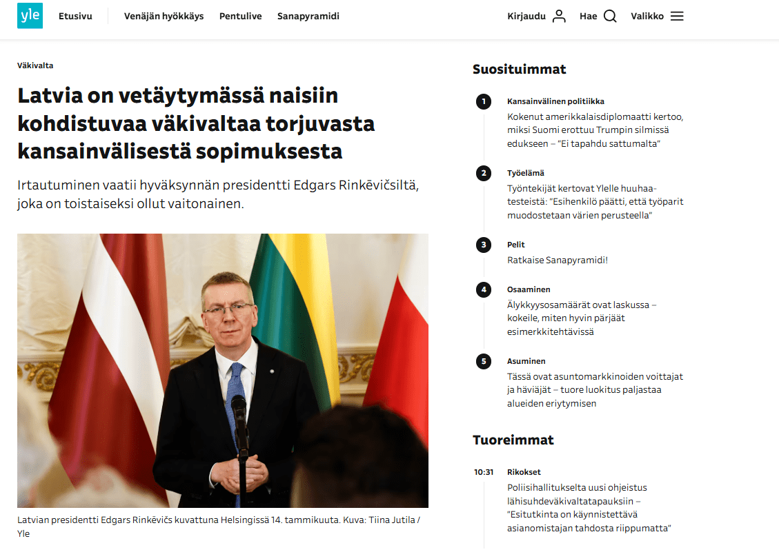 Šodien visi Latvijā runā par Saeimas lēmumu izstāties no Stambulas konvencijas. Kā tas notika, ko argumentēja, kāpēc tagad šis lemts, pareizi, nepareizi – cik cilvēku, tik viedokļu. Bet ko par šo Latvijas lēmumu raksta ārzemju mediji? Apskatām “Politico”, “Die Zeit” un “Yle”.