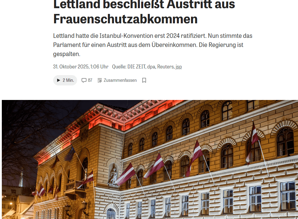 Latvija ratificēja 2011. gadā pieņemto konvenciju tikai 2024. gadā, un tagad kļūs par pirmo ES valsti, kas no tās izstājas. Lai izstāšanās stātos spēkā, likumu vēl ir jāapstiprina Valsts prezidentam Edgara Rinkēvičam.