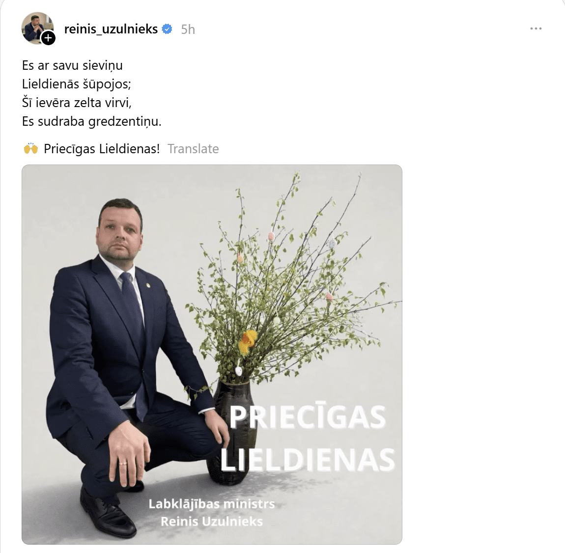 Kā ierasts, arī šogad cilvēki Lieldienu laikā sociālajos tīklos dalās ar svētku sveicieniem, krāsainu olu bildēm un sirsnīgiem vēlējumiem. Taču starp ierastajiem ierakstiem īpašu sabiedrības uzmanību izpelnījies labklājības ministra Reiņa Uzulnieka publicētais sveiciens, kas šoreiz raisījis nevis viennozīmīgas pozitīvas emocijas, bet gan neizpratni iedzīvotāju vidū.