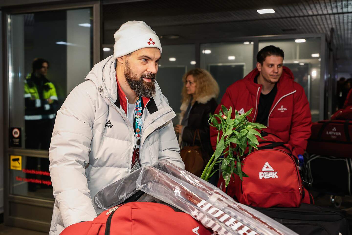 FOTO. Ar ovācijām mājās sagaida mūsu olimpiskos hokejistus un kalnu slēpotāju Bondari