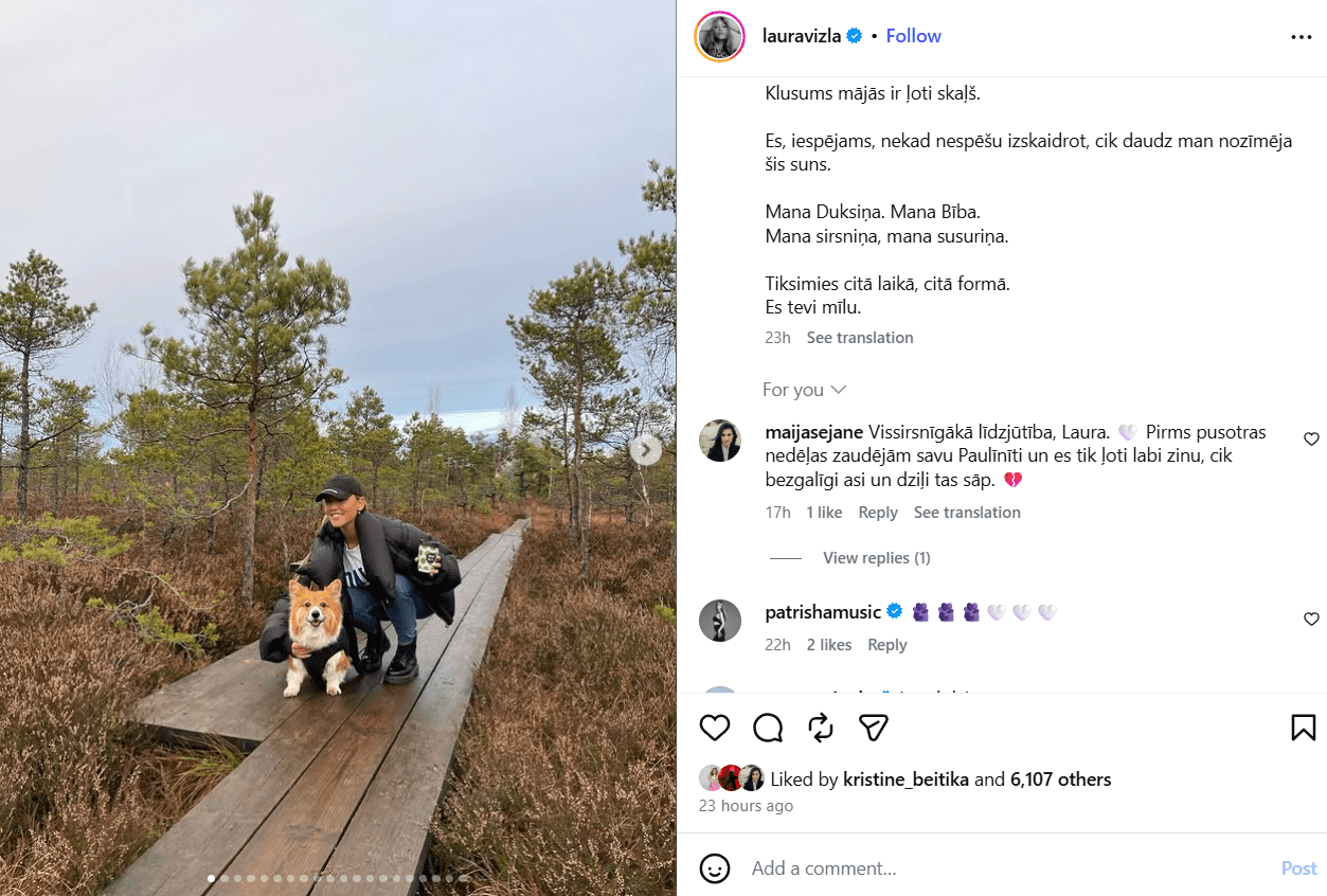 Sociālajos tīklos ar dziļi personisku un emocionālu ierakstu dalījusies influencere Laura Vizla, atklājot, ka mūžībā devies viņas ilggadējais četrkājainais draugs.