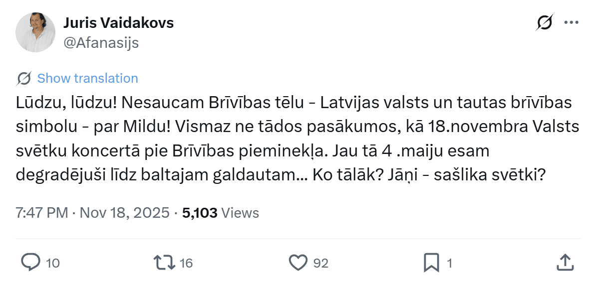 Viņš raksta: “Lūdzu, lūdzu! Nesaucam Brīvības tēlu – Latvijas valsts un tautas brīvības simbolu – par Mildu! Vismaz ne tādos pasākumos, kā 18.novembra Valsts svētku koncertā pie Brīvības pieminekļa. Jau tā 4 .maiju esam degradējuši līdz baltajam galdautam… Ko tālāk? Jāņi – šašlika svētki?”