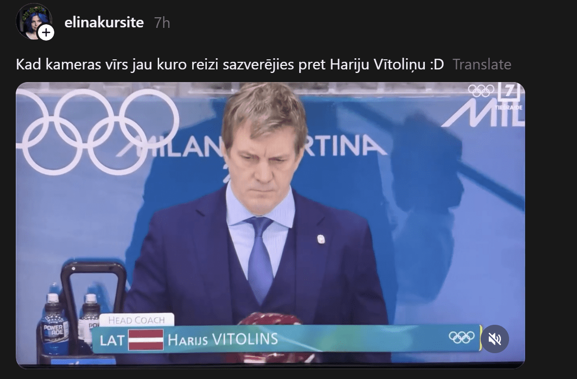 “Kad kameras vīrs jau kuro reizi sazverējies pret Hariju Vītoliņu,” vietnē “Threads” raksta Elīna. Video redzams Sandis Ozoliņš, taču titros viņš norādīts kā galvenais treneris Harijs Vītoliņš.