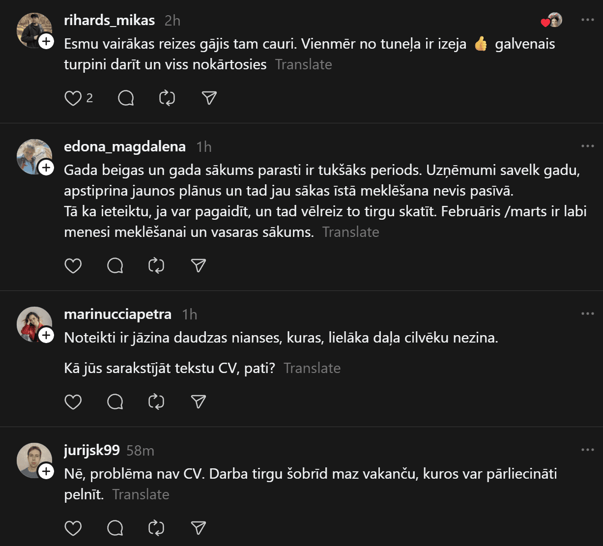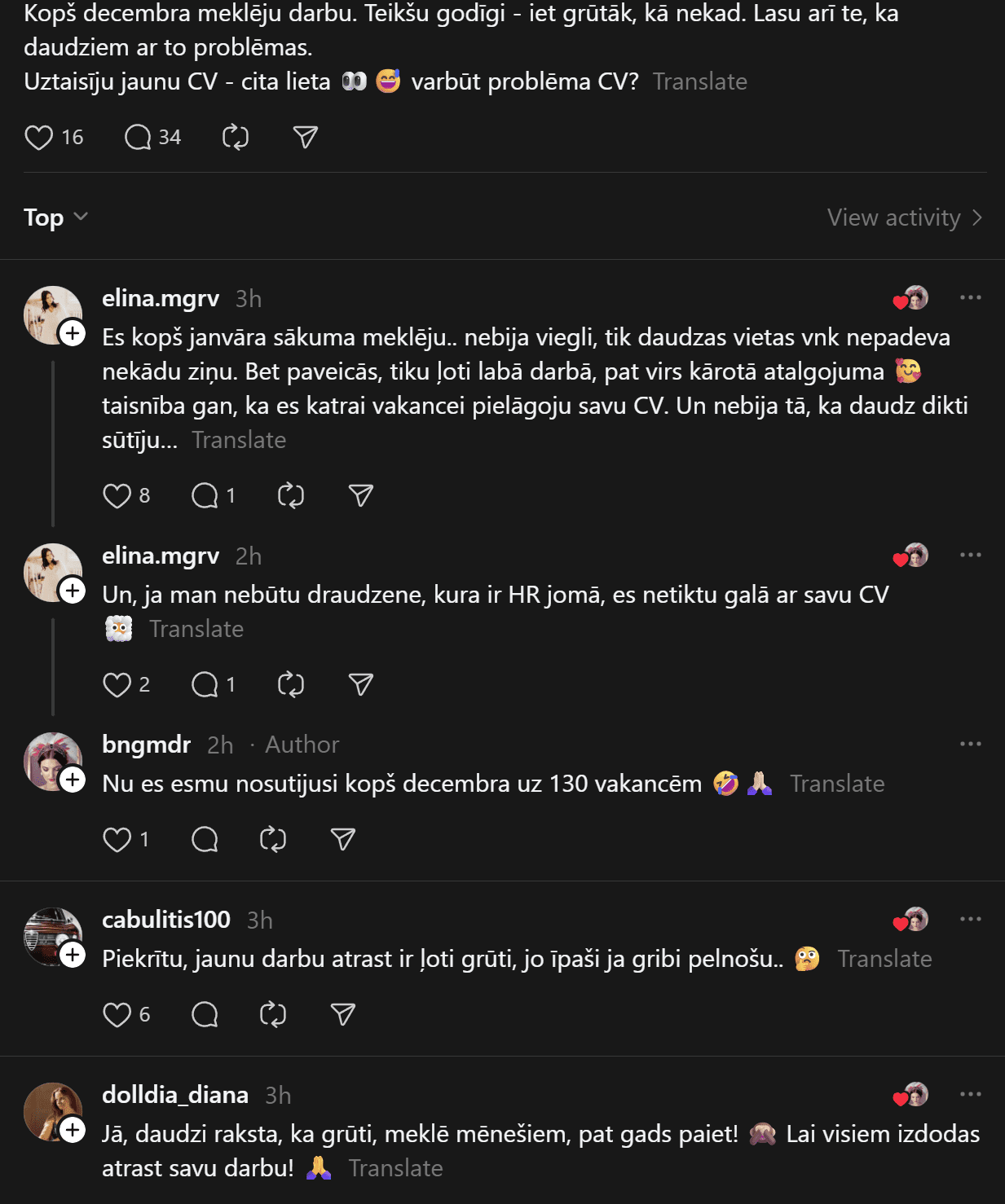 “Kopš decembra meklēju darbu. Teikšu godīgi – iet grūtāk, kā nekad. Esmu nosūtījusi 130 pieteikumus uz vakancēm. Lasu arī te, ka daudziem ar to problēmas. Uztaisīju jaunu CV – cita lieta. Varbūt problēma CV?” raksta kāda sieviete. Komentāros cilvēki stāsta, ka katrai vakancei pielāgojuši savu CV, cits norāda, ka, lai tiktu pie darba, bija jāiztur četras kārtas.
