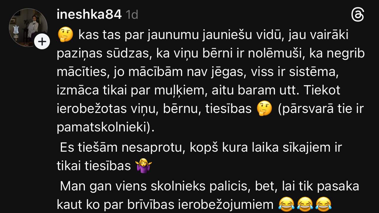 “Kas tas par jaunumu jauniešu vidū? Jau vairāki paziņas sūdzas, ka viņu bērni ir nolēmuši, ka negrib mācīties, jo mācībām nav jēgas, viss ir sistēma, izmāca tikai par muļķiem, aitu baru utt. Tiekot ierobežotas viņu – bērnu – tiesības (pārsvarā tie ir pamatskolnieki). Es tiešām nesaprotu, kopš kura laika sīkajiem ir tikai tiesības. Man gan viens skolnieks palicis, bet, lai tik pasaka kaut ko par brīvības ierobežojumiem,” neizpratnē ir Inese.