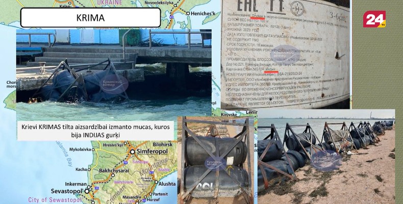 “Ukraiņi uzoduši, ka krievi Krimas tilta aizsardzībai izmanto mucas, kurās bija Indijas gurķi atsūtīti,” TV24 raidījumā “Aktuālais par karadarbību Ukrainā” smejoties stāsta Jānis Slaidiņš, NBS majors, Zemessardzes štāba virsnieks.