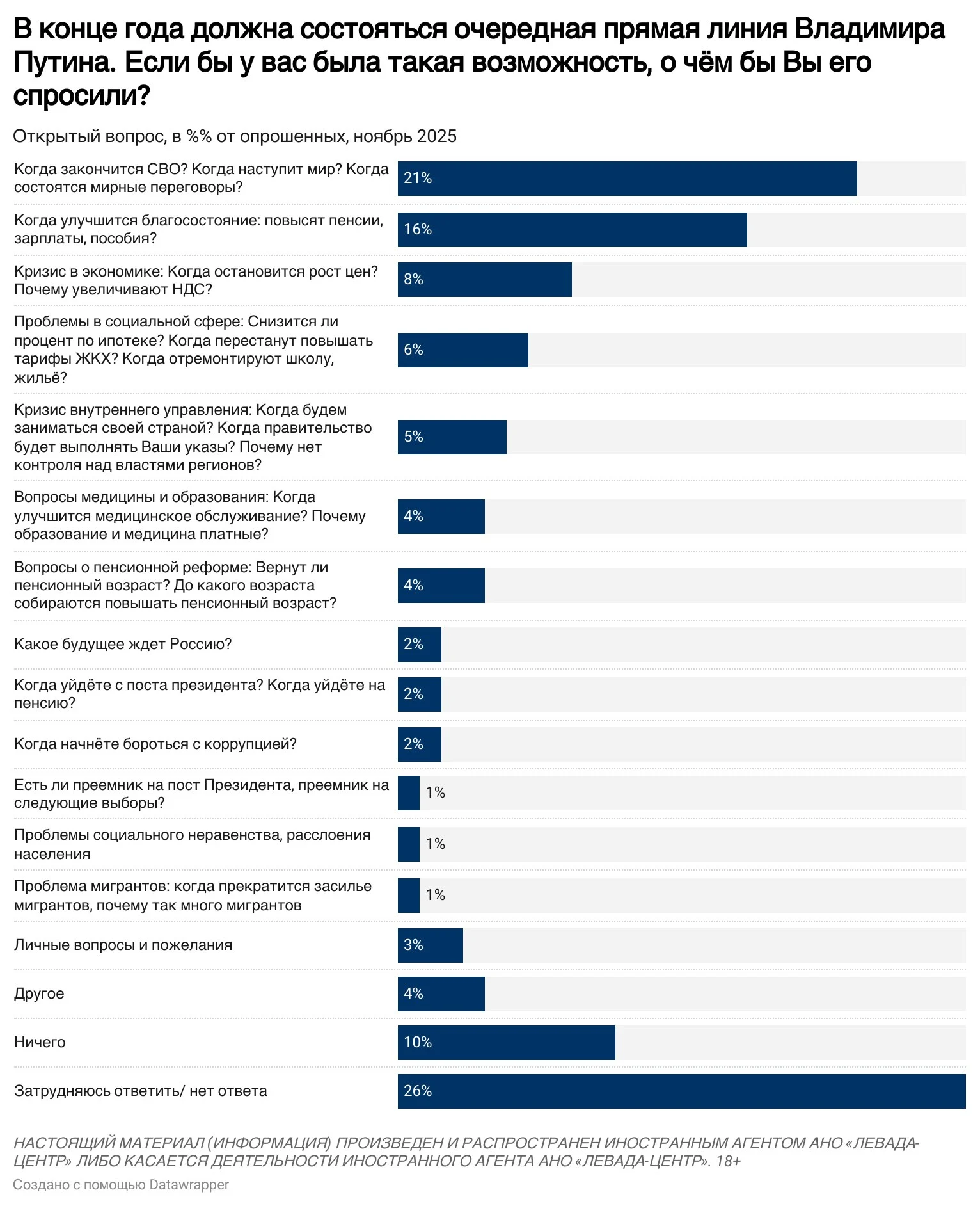 Tādējādi 8% respondentu vēlas jautāt diktatoram par ekonomikas stāvokli. Jo īpaši viņus interesē, kad beigsies melnā svītra ekonomikā, kāpēc cenas turpina pieaugt un kāpēc varas iestādes palielina PVN. 16% respondentu interesējas, kad uzlabosies ienākumi, pensijas un dzīves līmenis. Personīgā labklājība ir otra populārākā tēma, ko Krievijas Federācijas iedzīvotāji vēlas apspriest ar Putinu.