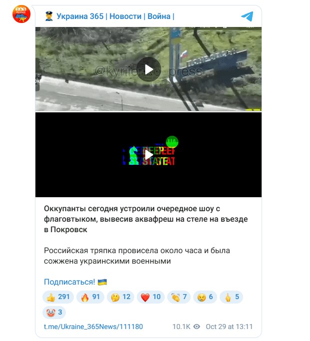 Ap pulksten 9:40 no rīta Pokrovskā uz ēkas uzlikts Krievijas karogs tika pamanīts un stundu vēlāk Ukrainas aizsardzības spēki to iznīcināja. Pēc karavīru teiktā, reakcija bija tūlītēja: ienaidnieka pozīcija tika identificēta un ar precīzu triecienu likvidēta. Par to šorīt ziņoja “DeepState” projekts.