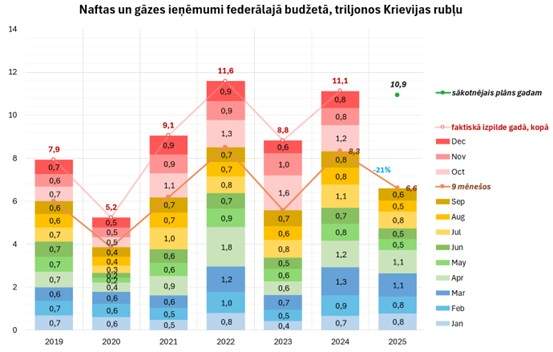 Naftas un gāzes ieņēmumi šī gada 9 mēnešos bija vairs tikai 6,6 trilj. RUR, kas ir par 21,0 % mazāk nekā pirms gada, un ir acīmredzams, ka gada beigās tie nesasniegs sākotnēji budžetā plānoto apjomu (10,9 trilj. RUR); visdrīzāk, to kopējais apjoms 2025.gadā būs vien 8,5 trilj. RUR.