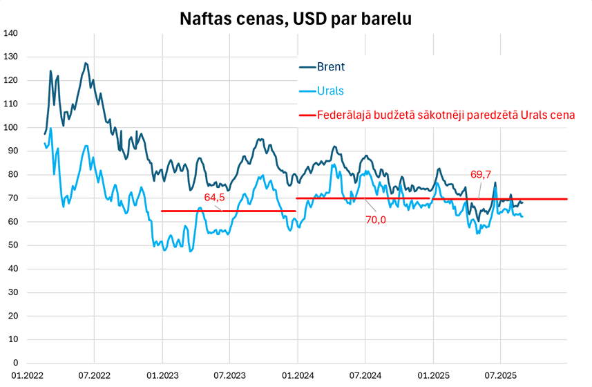 Energoresursu cenas šobrīd ir zemākas nekā tika sākotnēji paredzēts. Sastādot federālo budžetu 2025. gadam, tika plānots, ka Urals naftas cena šogad būs vidēji 69,7 USD par barelu. Taču faktiskā cena jau kopš pavasara ir noslīdējusi zem plānotā līmeņa.