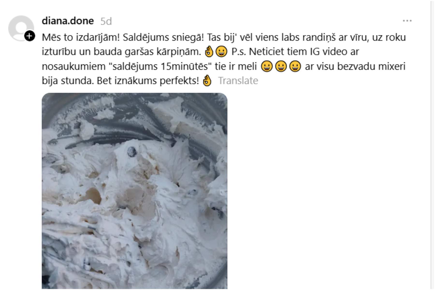 Taču, ak vai, – daudzi sūdzas, ka šis brūvējums ir ārkārtīgi salds. Daudziem nemaz īsti nav gājis pie dūšas šāds pašgatavots saldējums, bet daudzi arī slavē procesu un kopābūšanas prieku, ko šis saldējums ir devis.