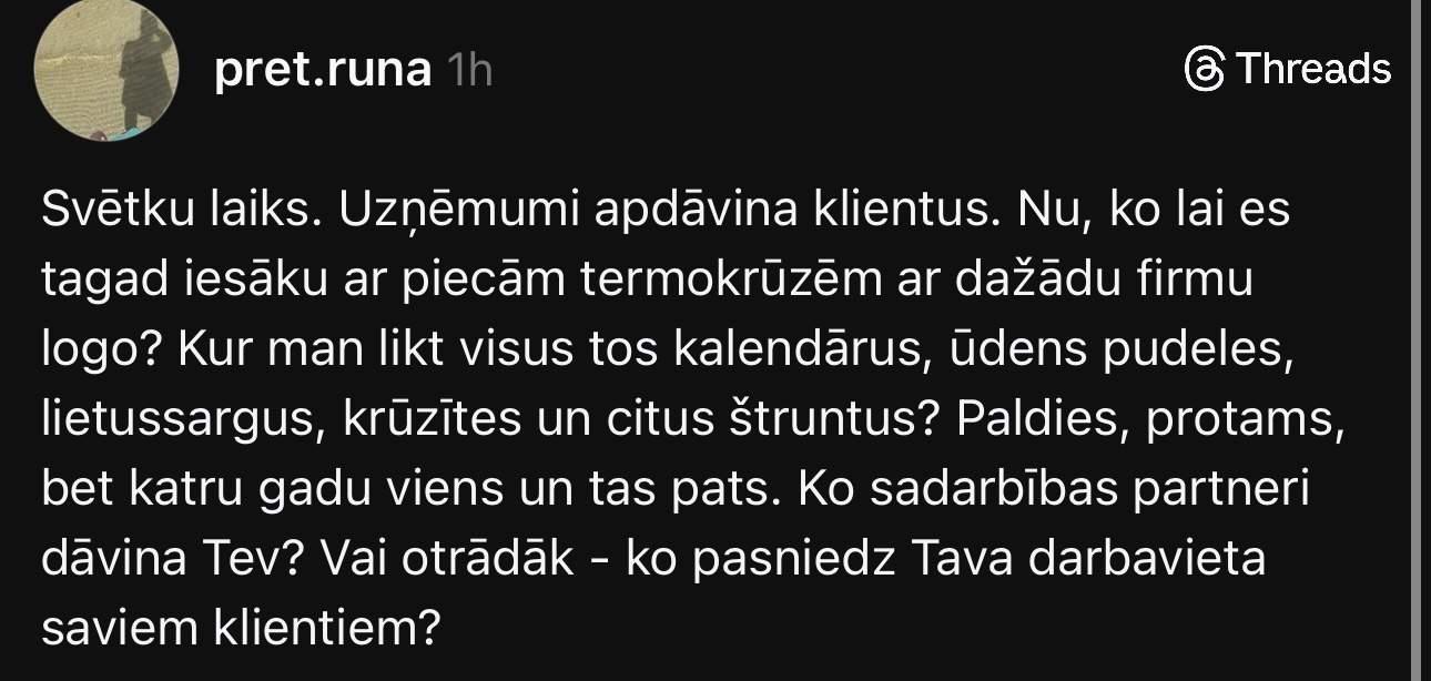 “Svētku laiks. Uzņēmumi apdāvina klientus. Nu, ko lai es tagad iesāku ar piecām termokrūzēm ar dažādu firmu logo? Kur man likt visus tos kalendārus, ūdens pudeles, lietussargus, krūzītes un citus štruntus? Paldies, protams, bet katru gadu viens un tas pats. Ko sadarbības partneri dāvina Tev? Vai, otrādāk, ko pasniedz Tava darbavieta saviem klientiem?” vietnē “Threads” jautā persona ar segvārdu @pret.runa.